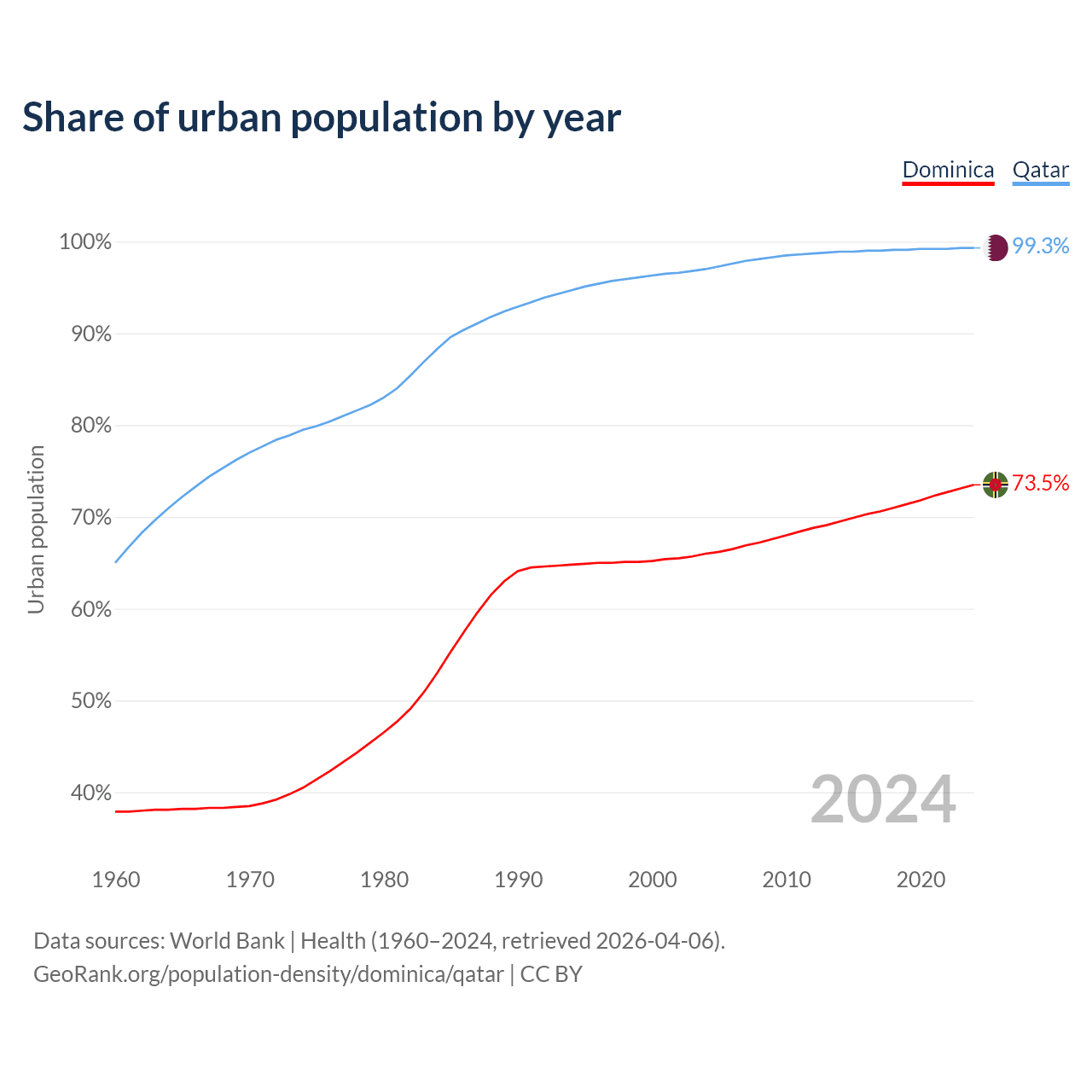From 2004 to 2024, the share of urban population changed from 66% to 73.5% in Dominica and from 97% to 99.3% in Qatar.