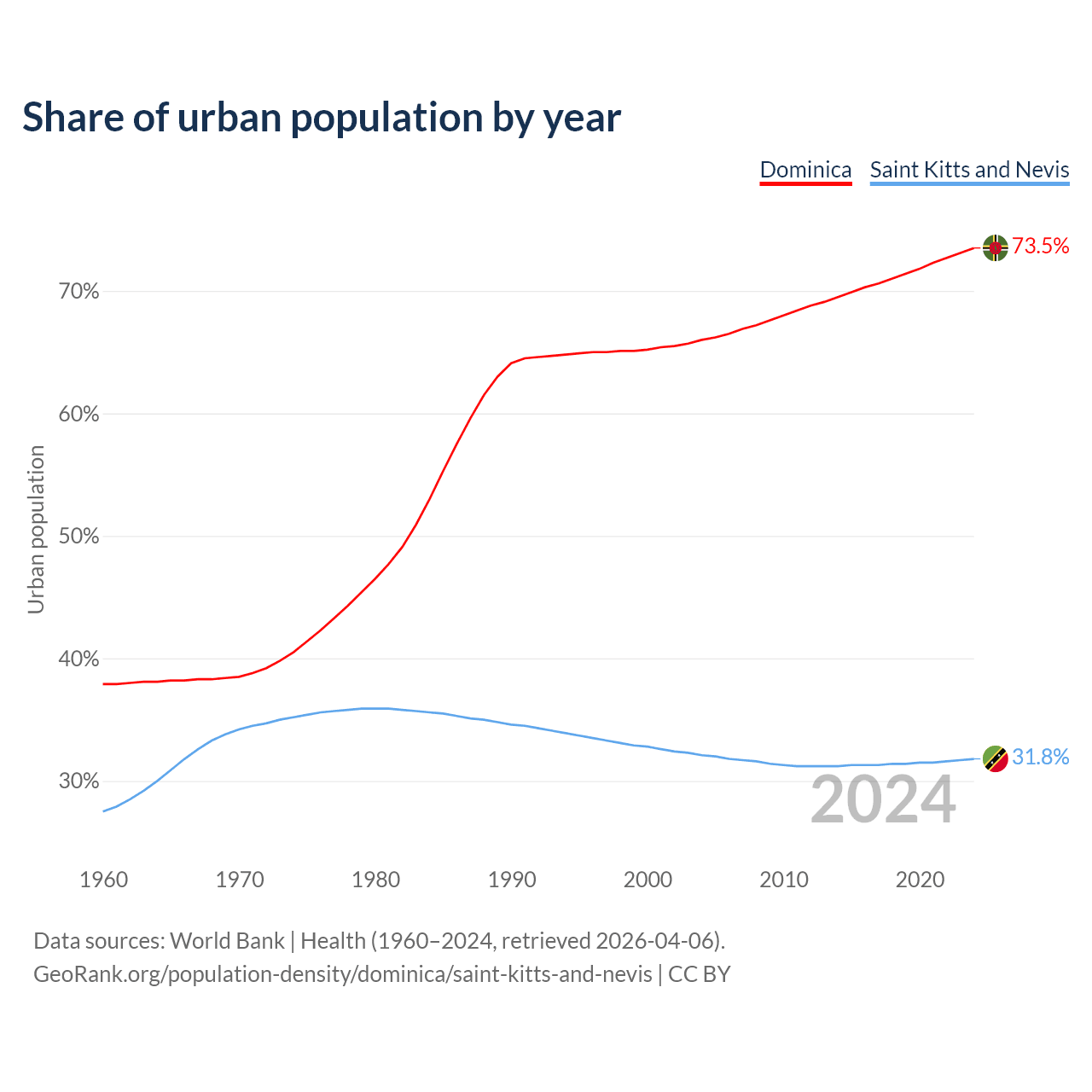 From 2004 to 2024, the share of urban population changed from 66% to 73.5% in Dominica and from 32.1% to 31.8% in Saint Kitts and Nevis.