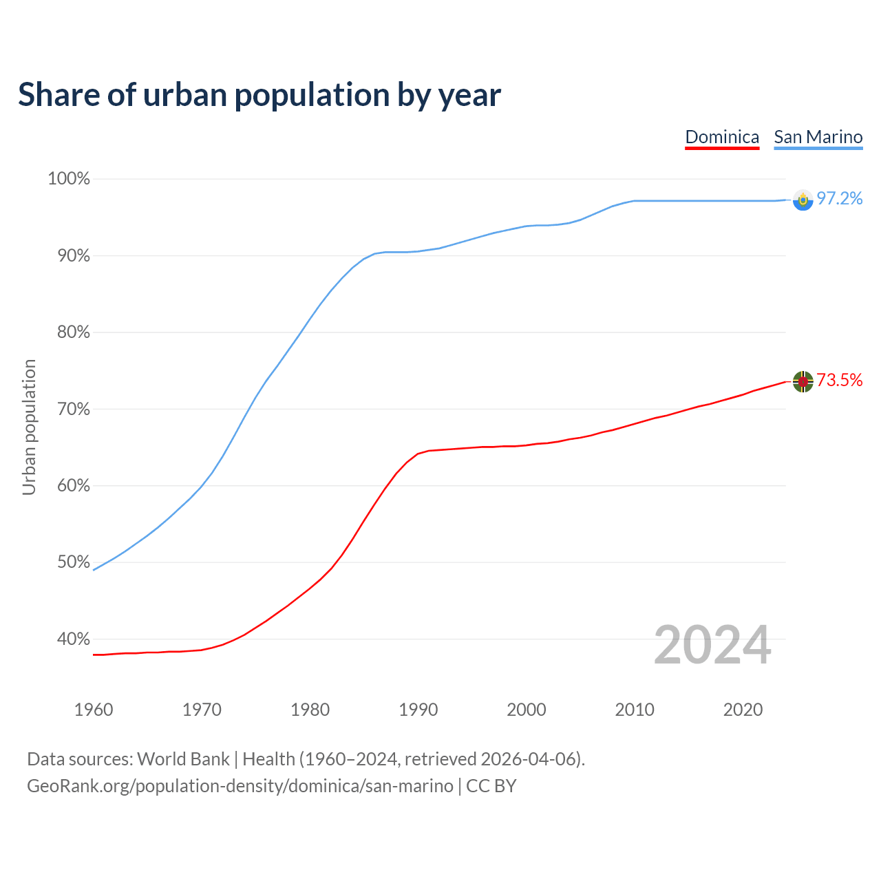 From 2004 to 2024, the share of urban population changed from 66% to 73.5% in Dominica and from 94.2% to 97.2% in San Marino.