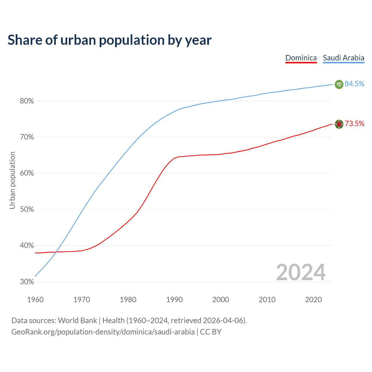 From 2004 to 2024, the share of urban population changed from 66% to 73.5% in Dominica and from 80.8% to 84.5% in Saudi Arabia.