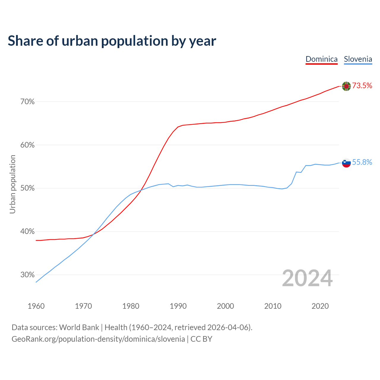 From 2004 to 2024, the share of urban population changed from 66% to 73.5% in Dominica and from 50.7% to 55.8% in Slovenia.