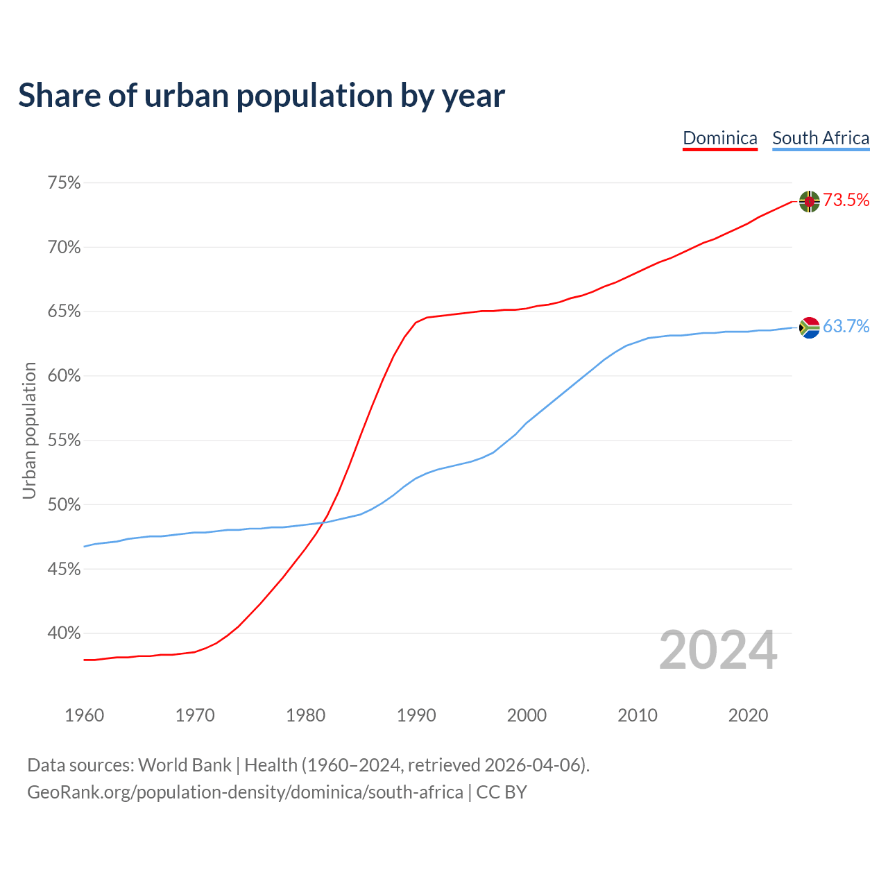 From 2004 to 2024, the share of urban population changed from 66% to 73.5% in Dominica and from 59.1% to 63.7% in South Africa.