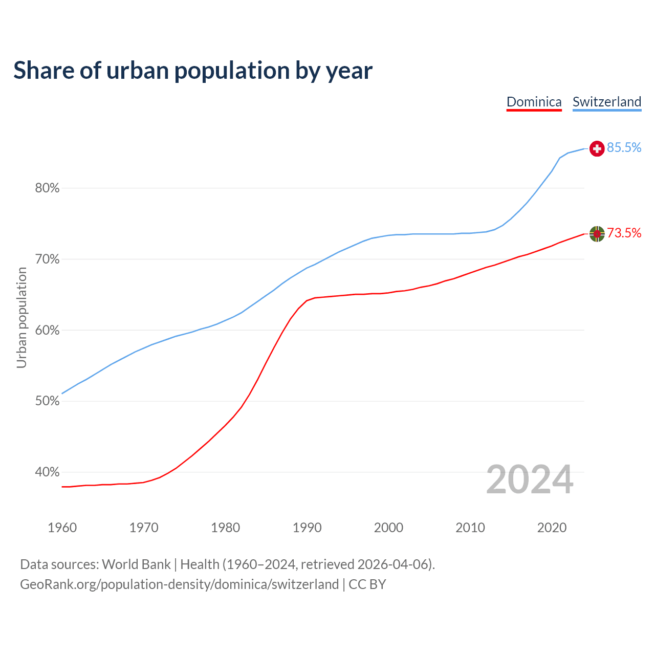 From 2004 to 2024, the share of urban population changed from 66% to 73.5% in Dominica and from 73.5% to 85.5% in Switzerland.