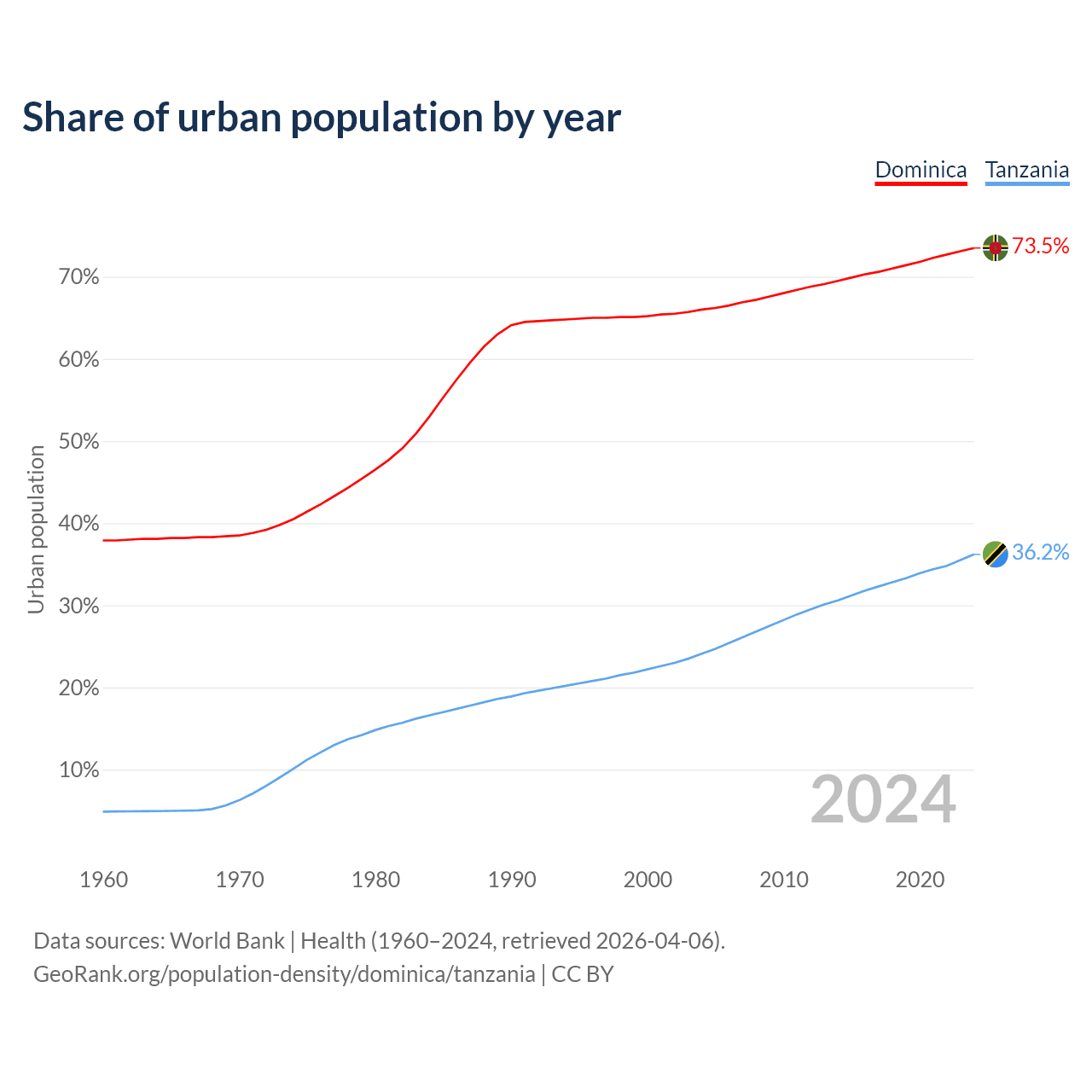 From 2004 to 2024, the share of urban population changed from 66% to 73.5% in Dominica and from 24.1% to 36.2% in Tanzania.