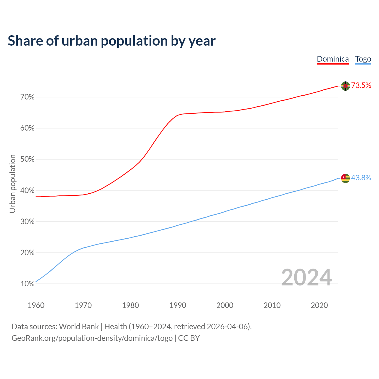 From 2004 to 2024, the share of urban population changed from 66% to 73.5% in Dominica and from 34.9% to 43.8% in Togo.
