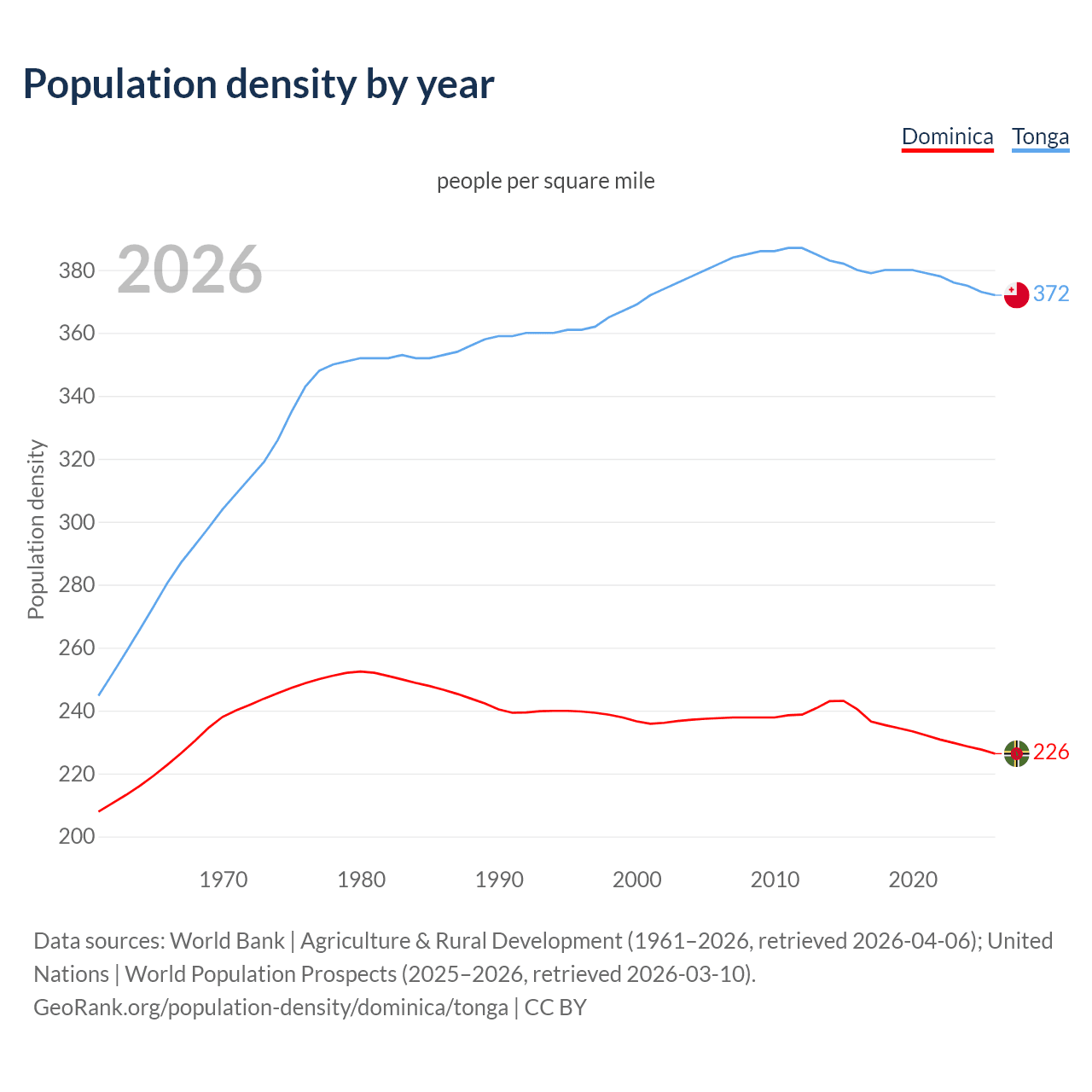 From 2006 to 2026, population density in Dominica decreased by 4.75%, compared to a 2.77% decline in Tonga.