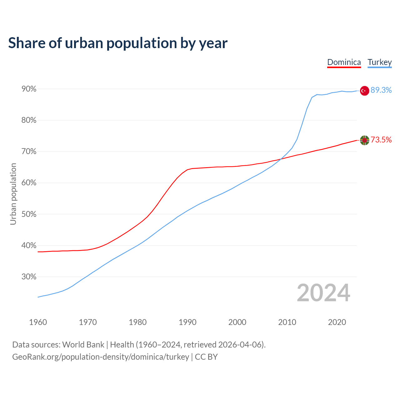 From 2004 to 2024, the share of urban population changed from 66% to 73.5% in Dominica and from 62.4% to 89.3% in Turkey.