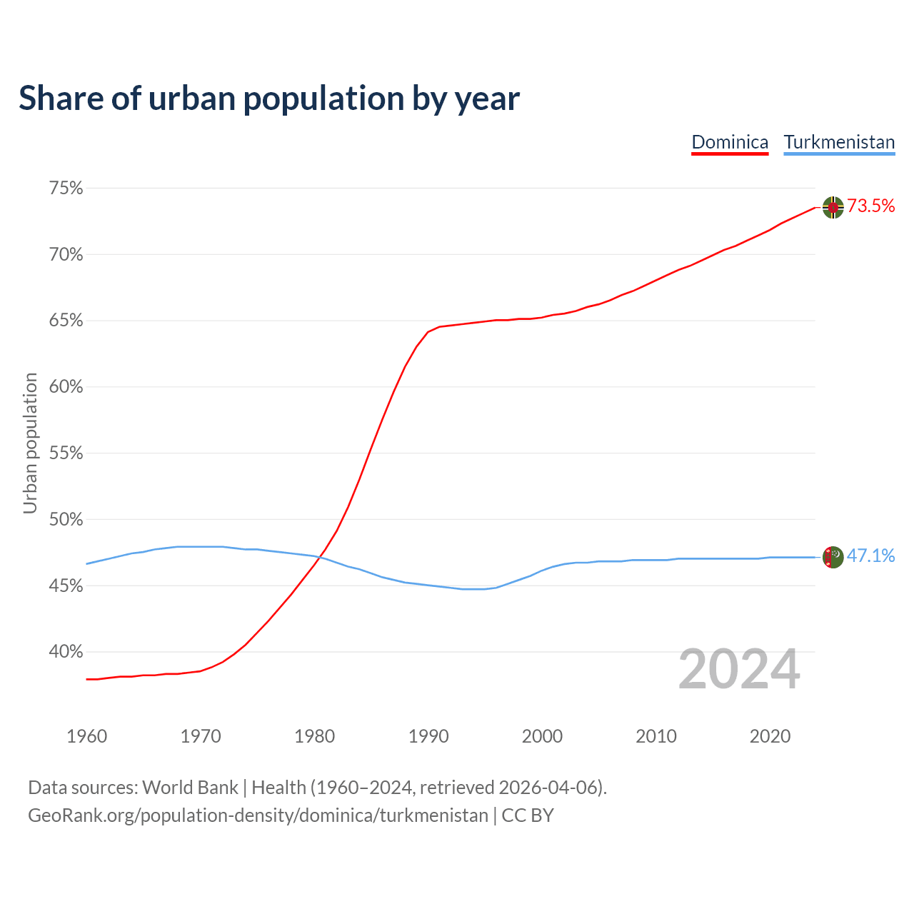 From 2004 to 2024, the share of urban population changed from 66% to 73.5% in Dominica and from 46.7% to 47.1% in Turkmenistan.
