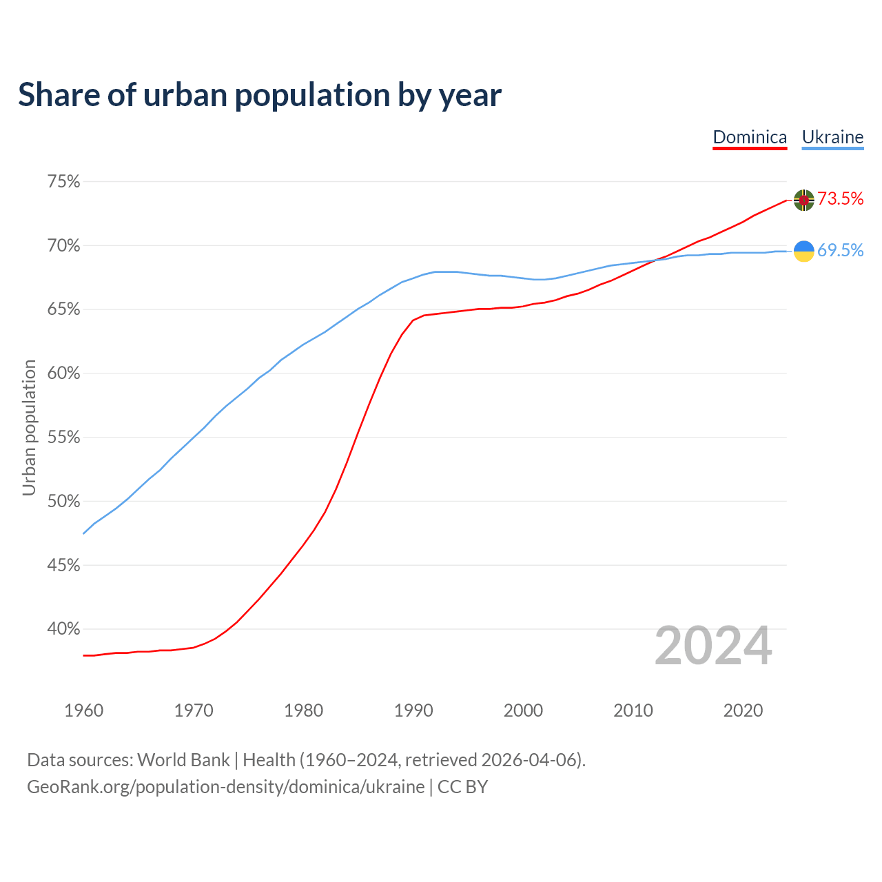 From 2004 to 2024, the share of urban population changed from 66% to 73.5% in Dominica and from 67.6% to 69.5% in Ukraine.