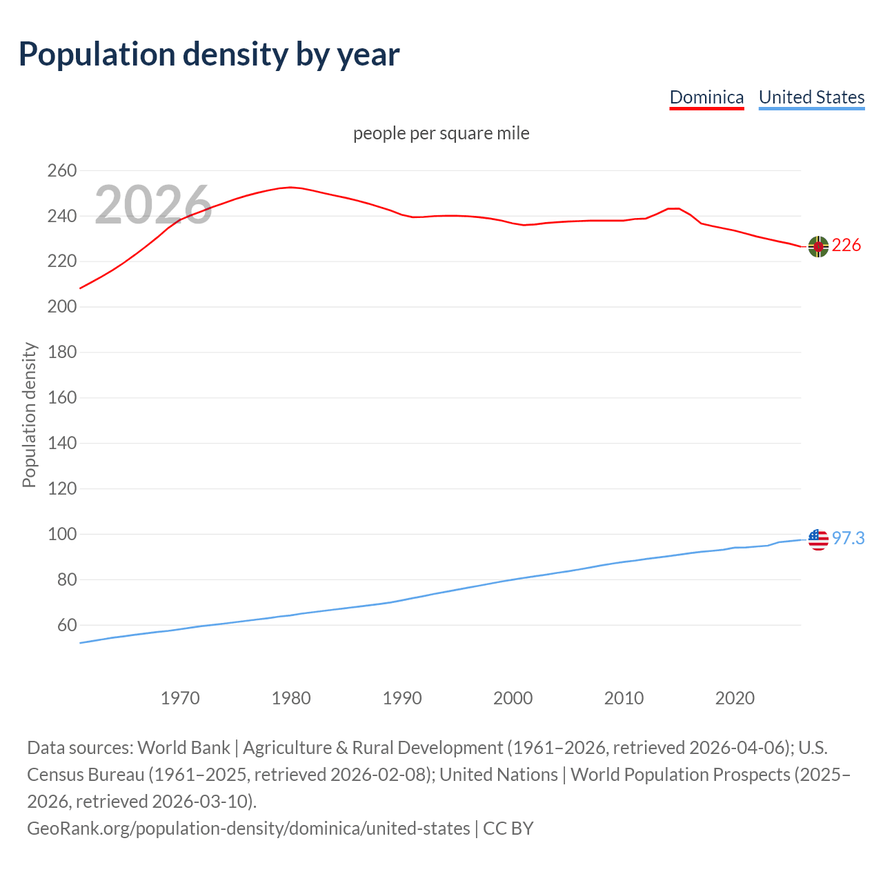 From 2006 to 2026, population density in Dominica decreased by 4.75%, compared to a 15.3% growth in the United States.