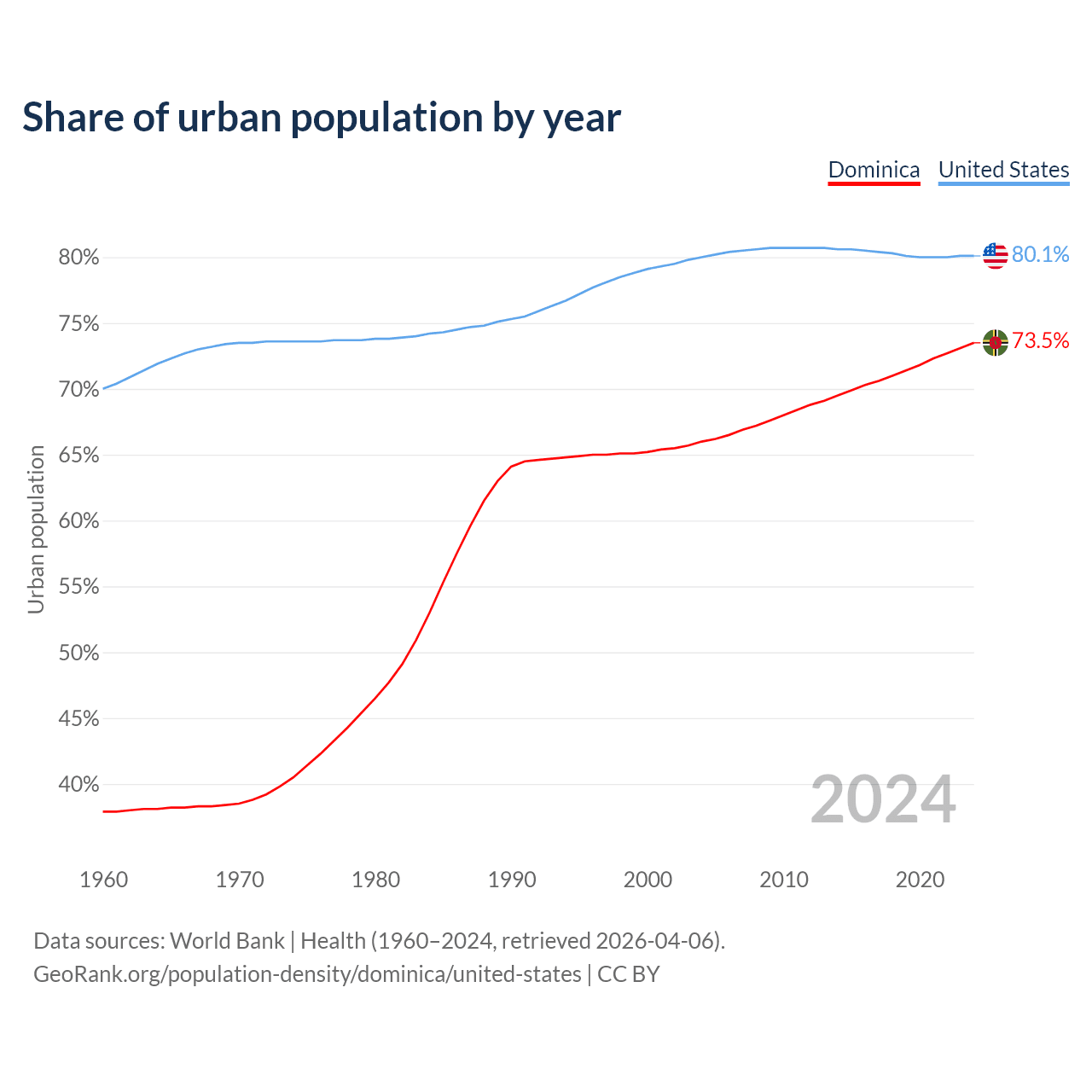From 2004 to 2024, the share of urban population changed from 66% to 73.5% in Dominica and from 80% to 80.1% in the United States.