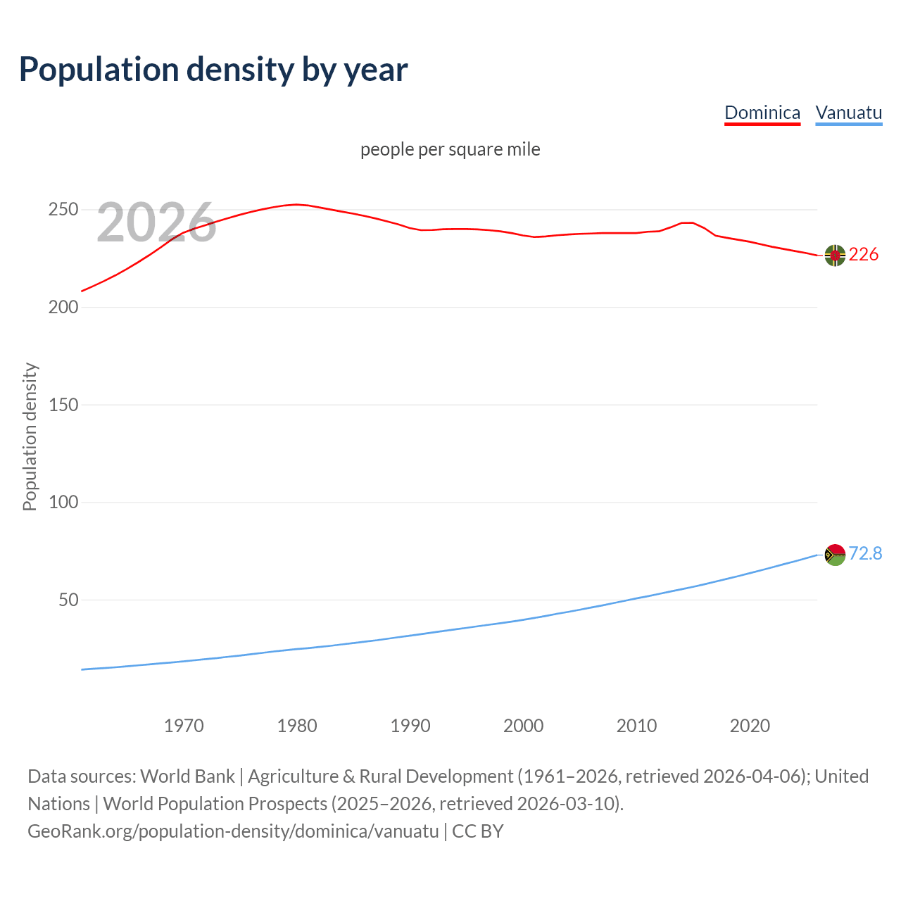 From 2006 to 2026, population density in Dominica decreased by 4.75%, compared to a 58.7% growth in Vanuatu.