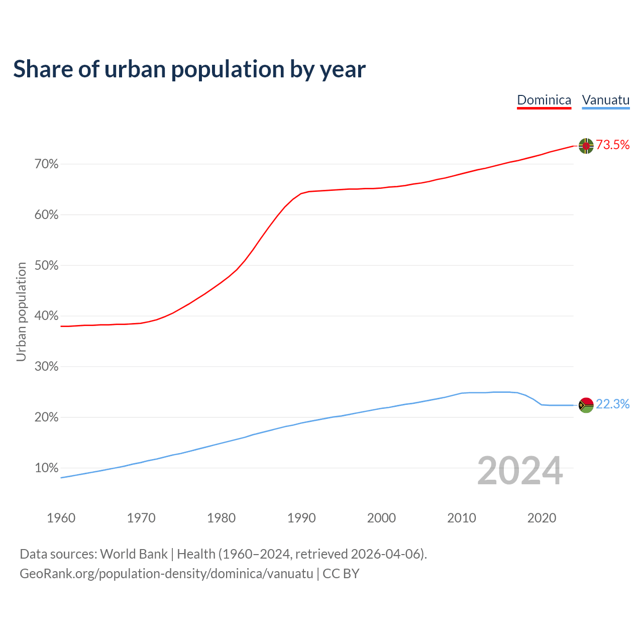 From 2004 to 2024, the share of urban population changed from 66% to 73.5% in Dominica and from 22.7% to 22.3% in Vanuatu.