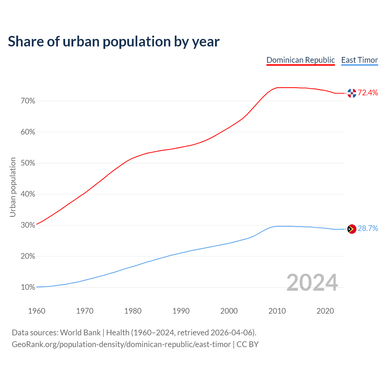 From 2004 to 2024, the share of urban population changed from 65.9% to 72.4% in the Dominican Republic and from 25.7% to 28.7% in East Timor.