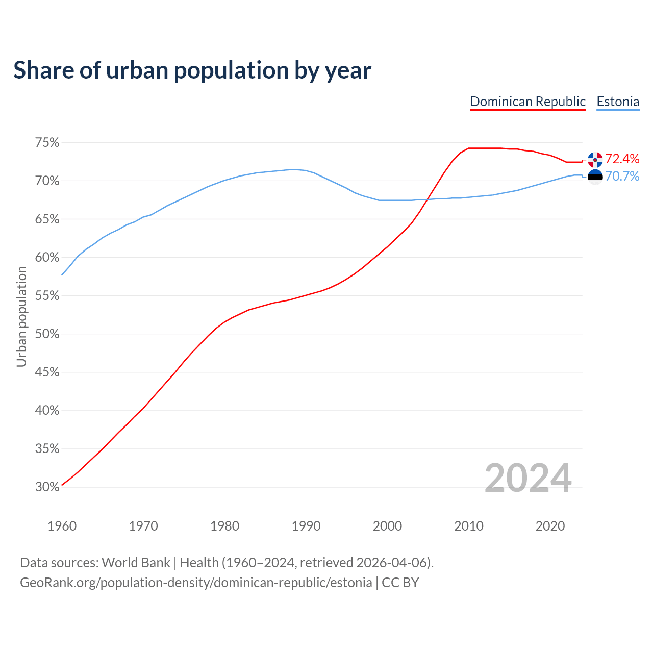 From 2004 to 2024, the share of urban population changed from 65.9% to 72.4% in the Dominican Republic and from 67.5% to 70.7% in Estonia.
