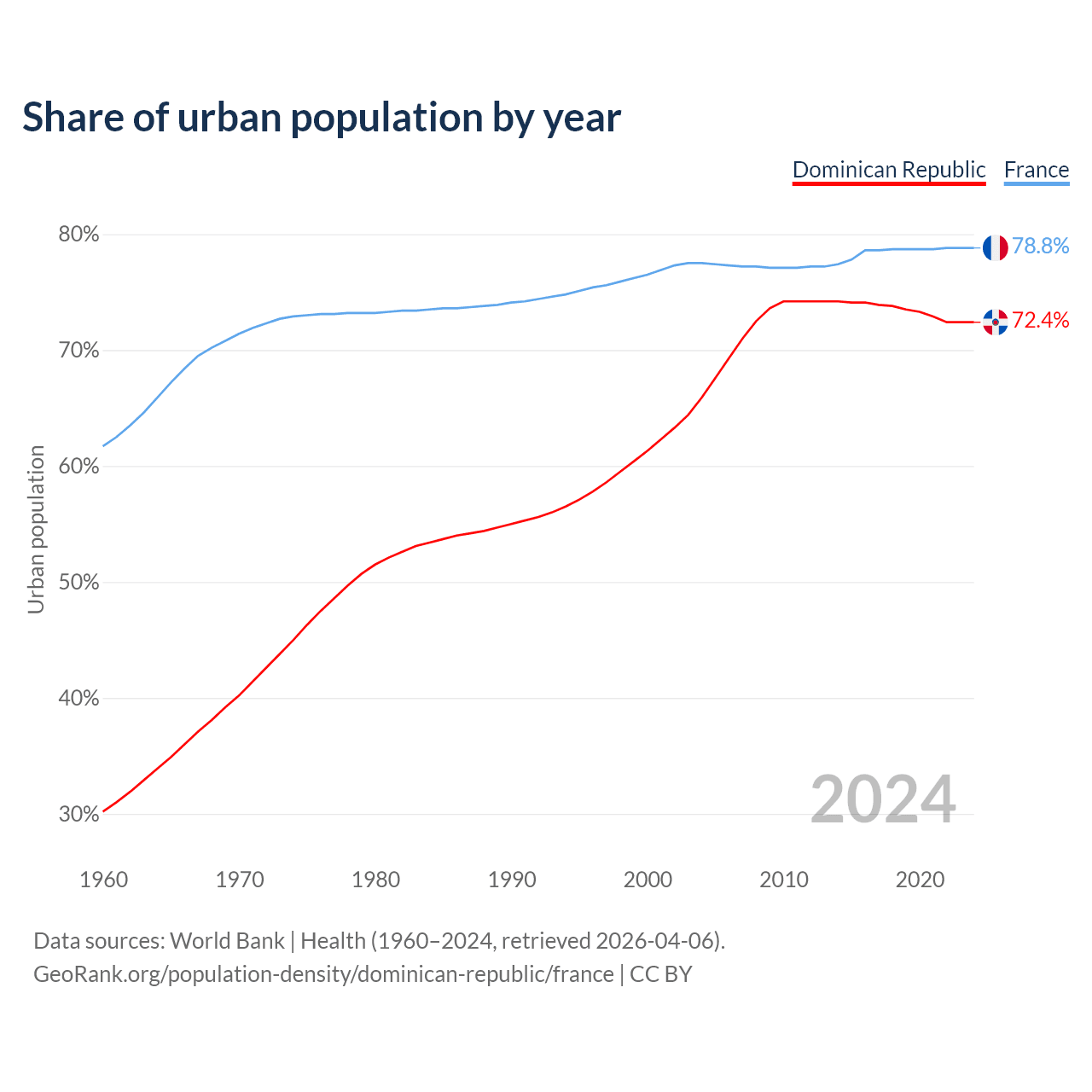 From 2004 to 2024, the share of urban population changed from 65.9% to 72.4% in the Dominican Republic and from 77.5% to 78.8% in France.