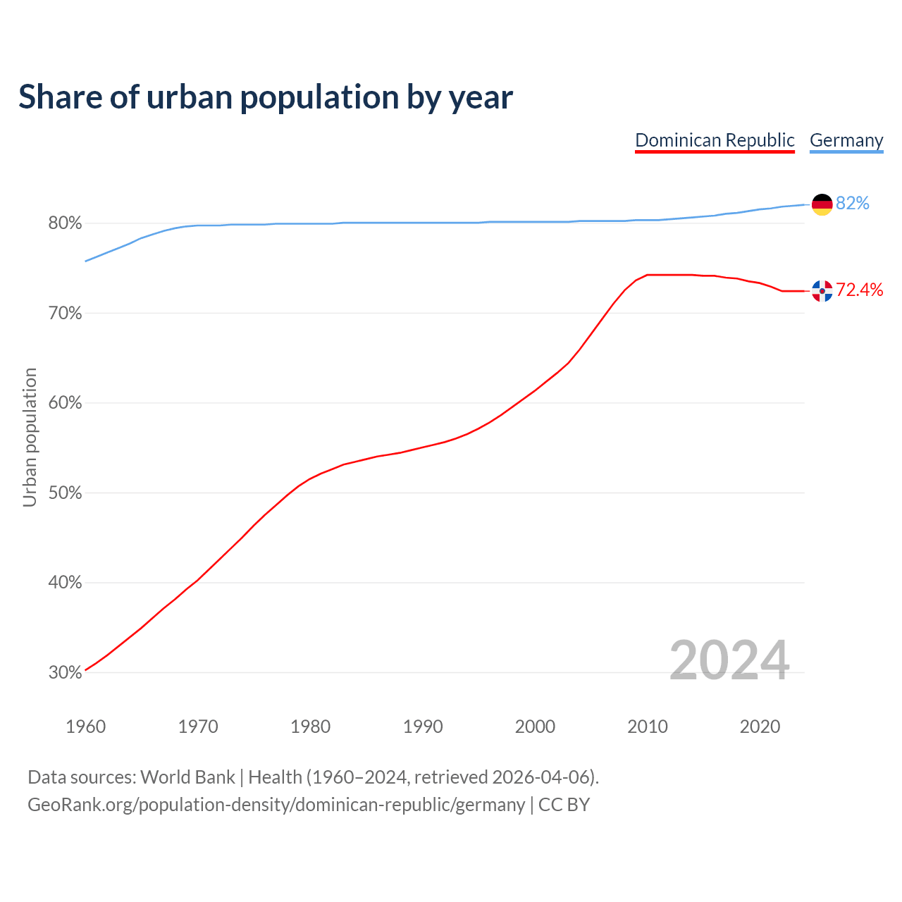 From 2004 to 2024, the share of urban population changed from 65.9% to 72.4% in the Dominican Republic and from 80.2% to 82% in Germany.