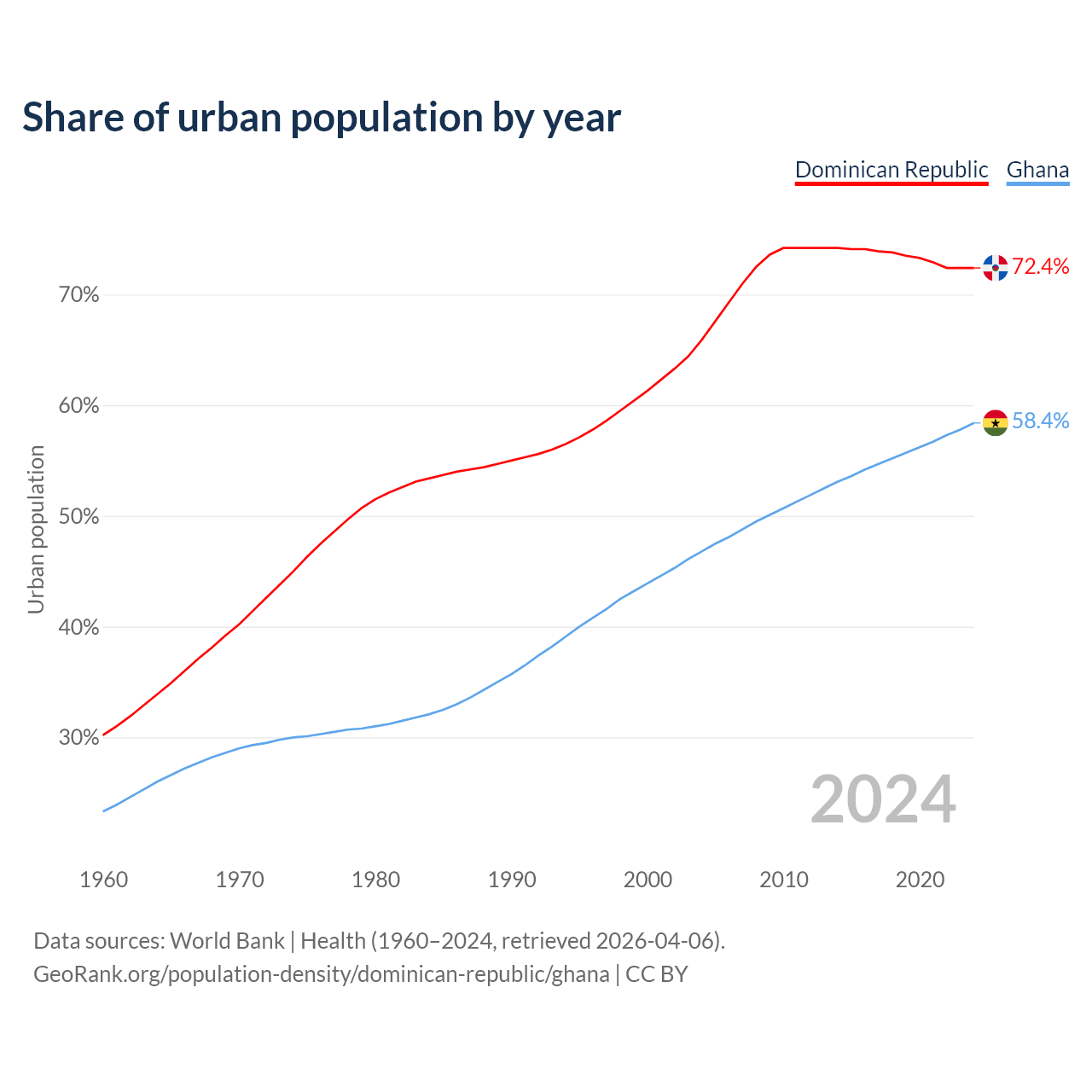From 2004 to 2024, the share of urban population changed from 65.9% to 72.4% in the Dominican Republic and from 46.8% to 58.4% in Ghana.