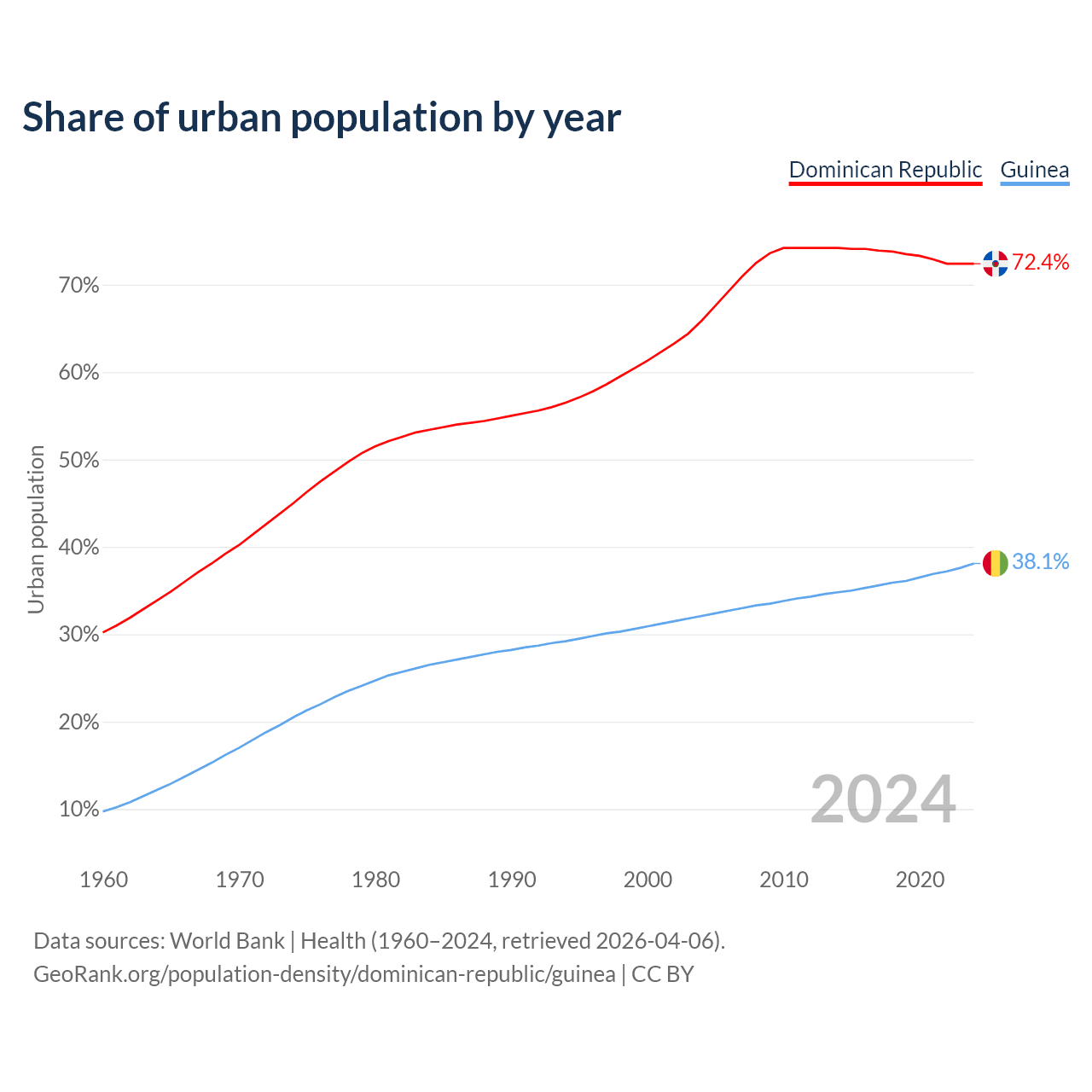 From 2004 to 2024, the share of urban population changed from 65.9% to 72.4% in the Dominican Republic and from 32.1% to 38.1% in Guinea.