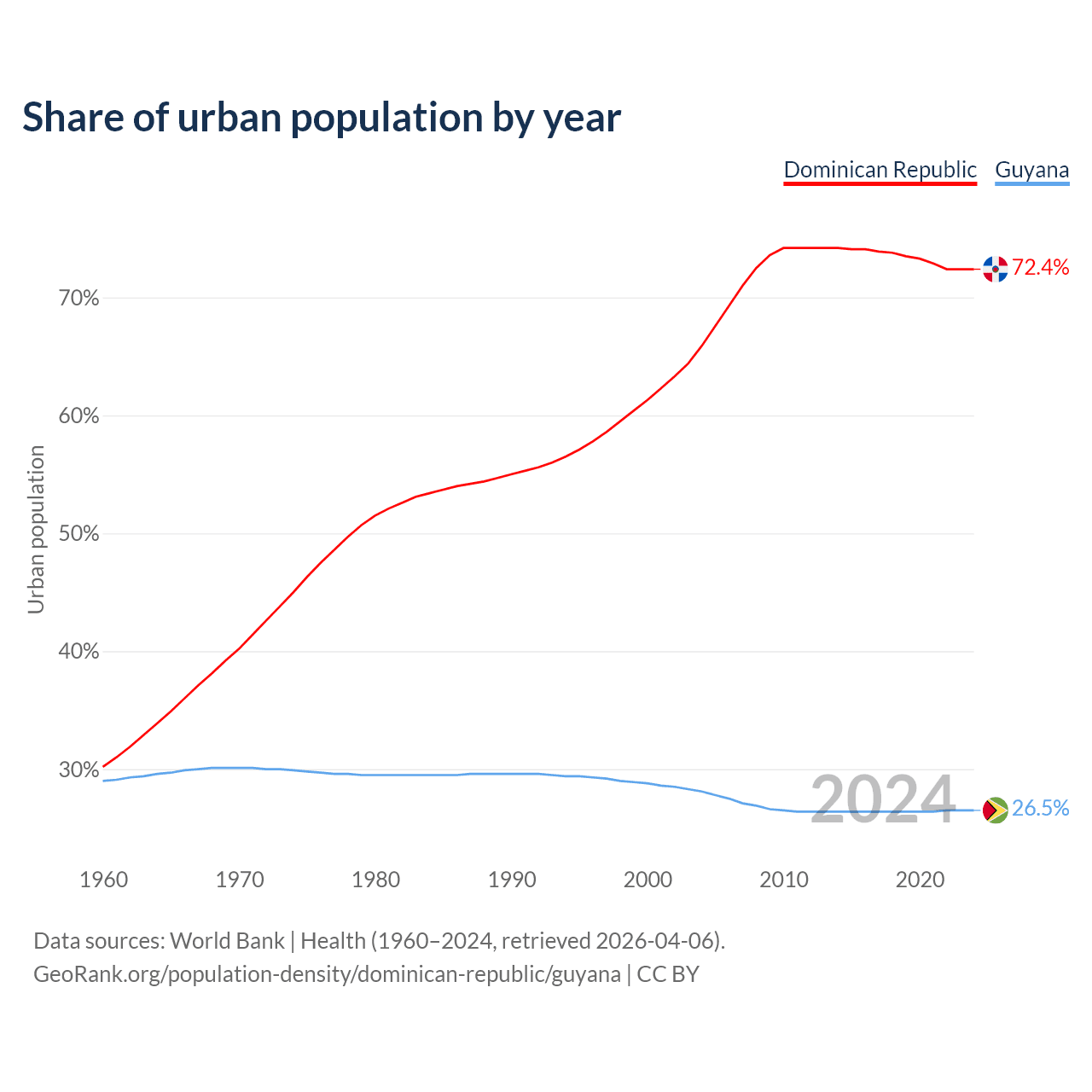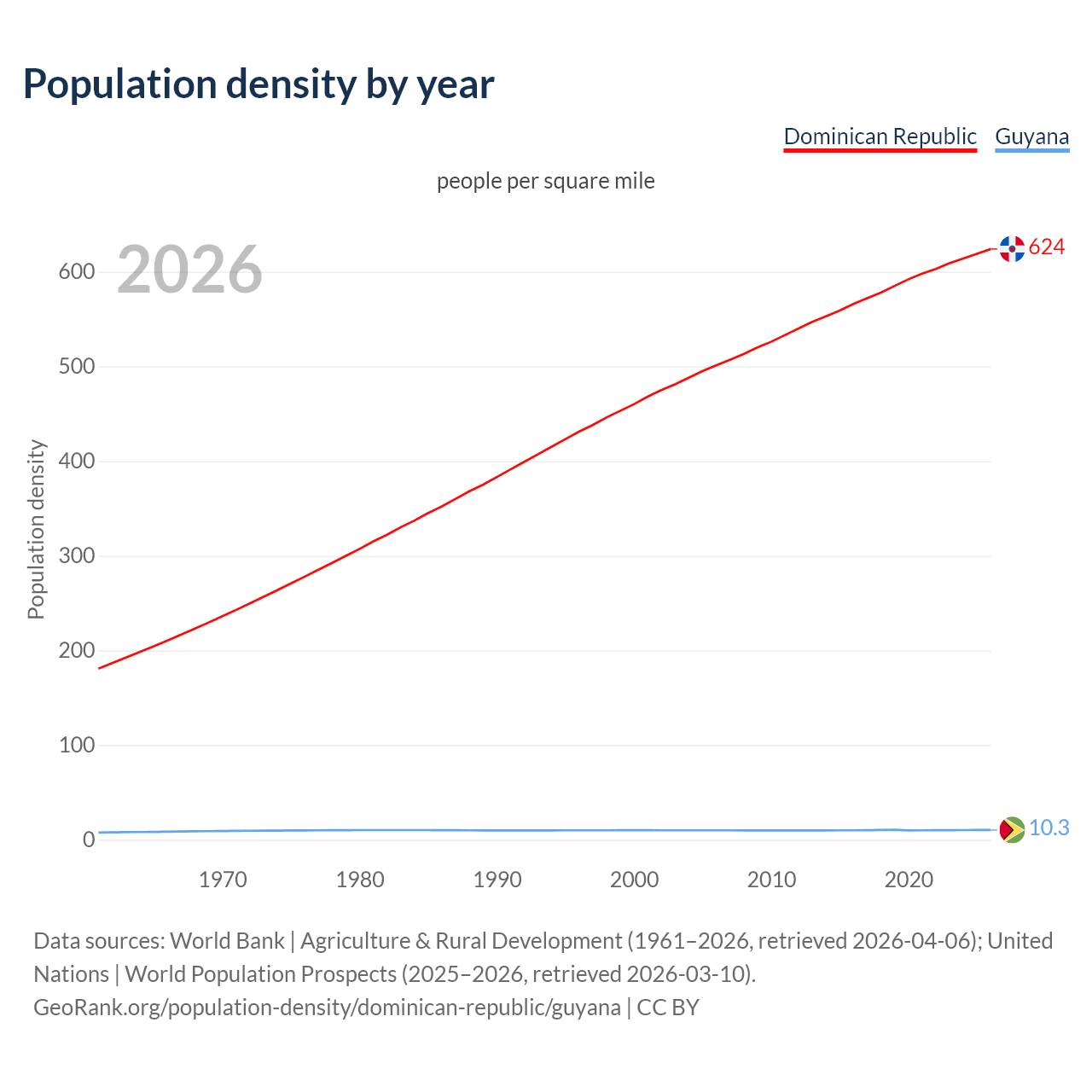 From 2006 to 2026, population density in the Dominican Republic increased by 24.6%, compared to a 3.3% growth in Guyana.