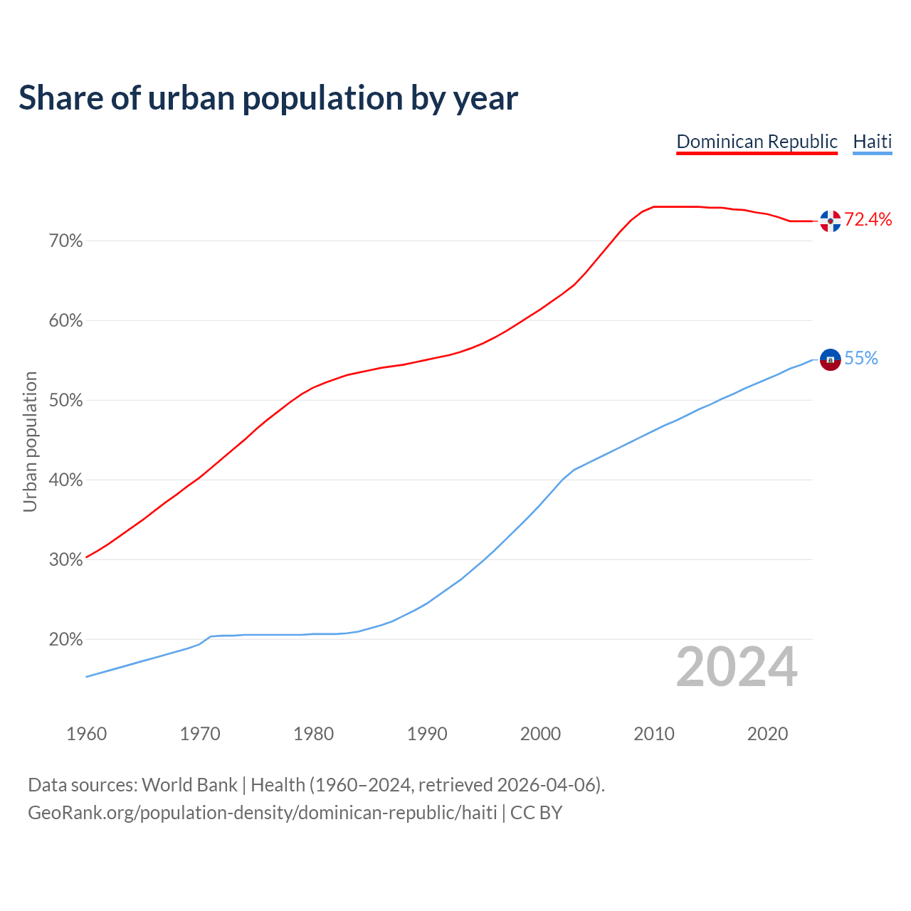 From 2004 to 2024, the share of urban population changed from 65.9% to 72.4% in the Dominican Republic and from 41.9% to 55% in Haiti.