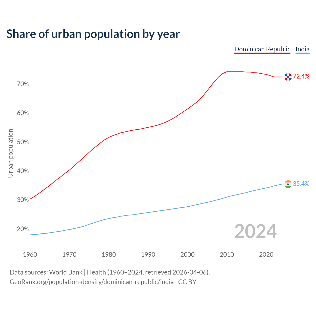 From 2004 to 2024, the share of urban population changed from 65.9% to 72.4% in the Dominican Republic and from 28.8% to 35.4% in India.