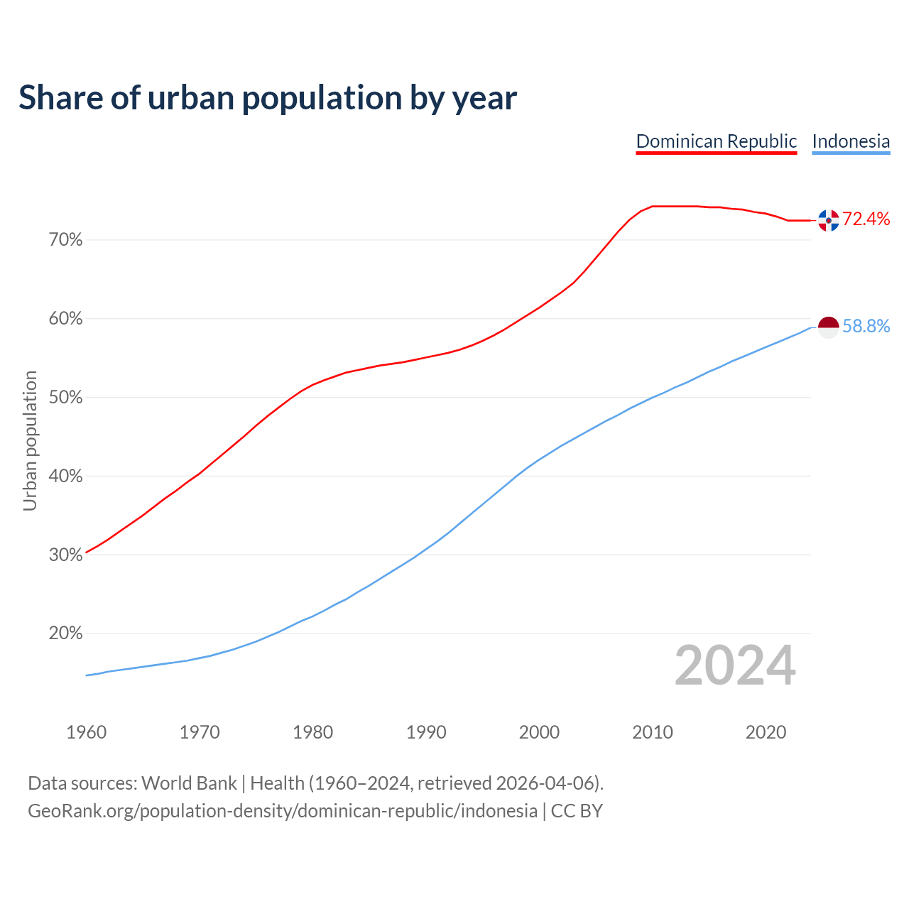 From 2004 to 2024, the share of urban population changed from 65.9% to 72.4% in the Dominican Republic and from 45.4% to 58.8% in Indonesia.