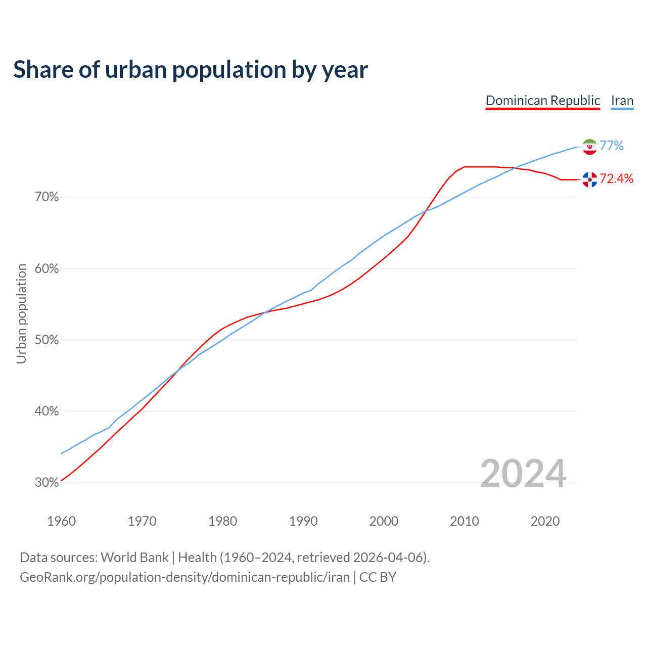 From 2004 to 2024, the share of urban population changed from 65.9% to 72.4% in the Dominican Republic and from 67.3% to 77% in Iran.