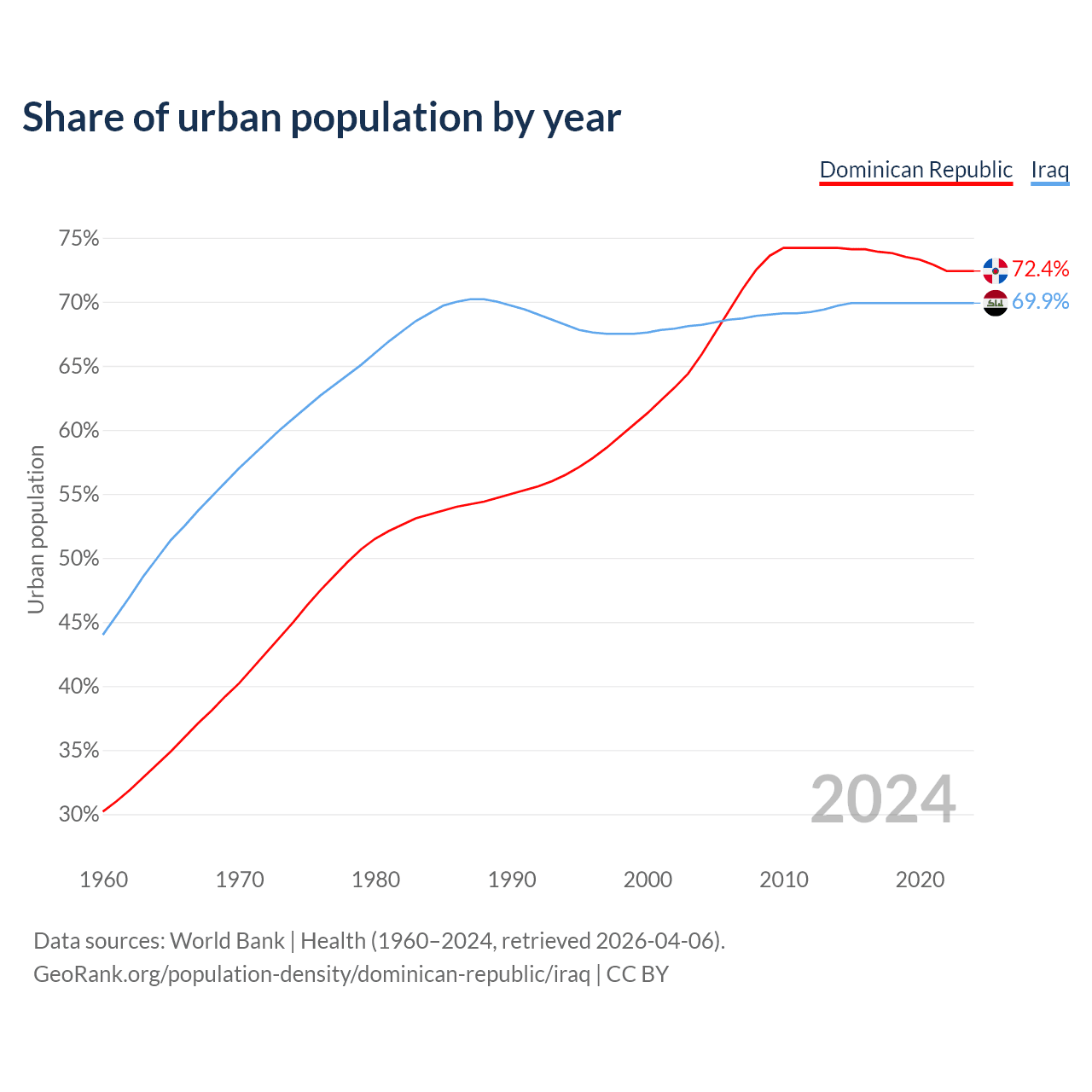 From 2004 to 2024, the share of urban population changed from 65.9% to 72.4% in the Dominican Republic and from 68.2% to 69.9% in Iraq.