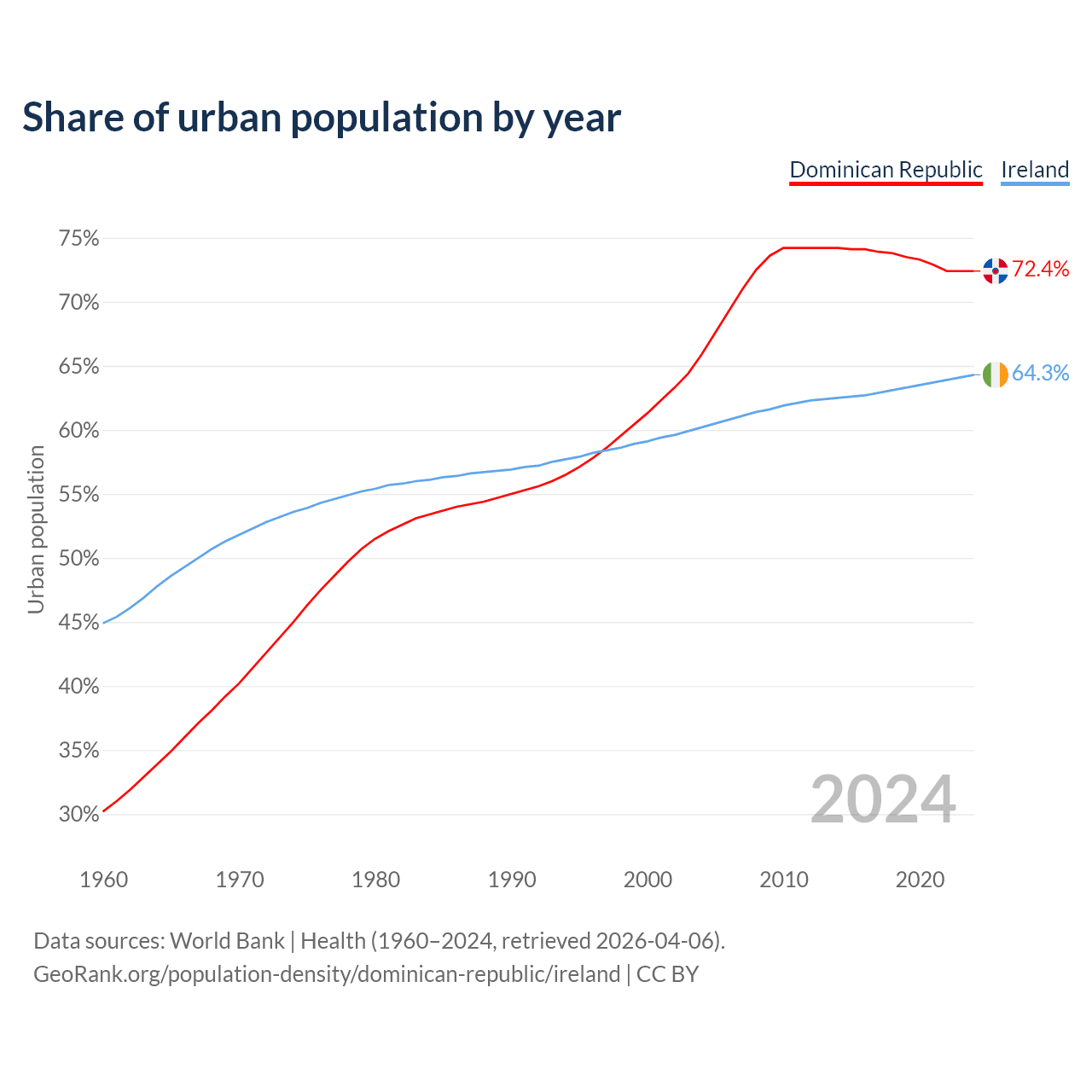 From 2004 to 2024, the share of urban population changed from 65.9% to 72.4% in the Dominican Republic and from 60.2% to 64.3% in Ireland.