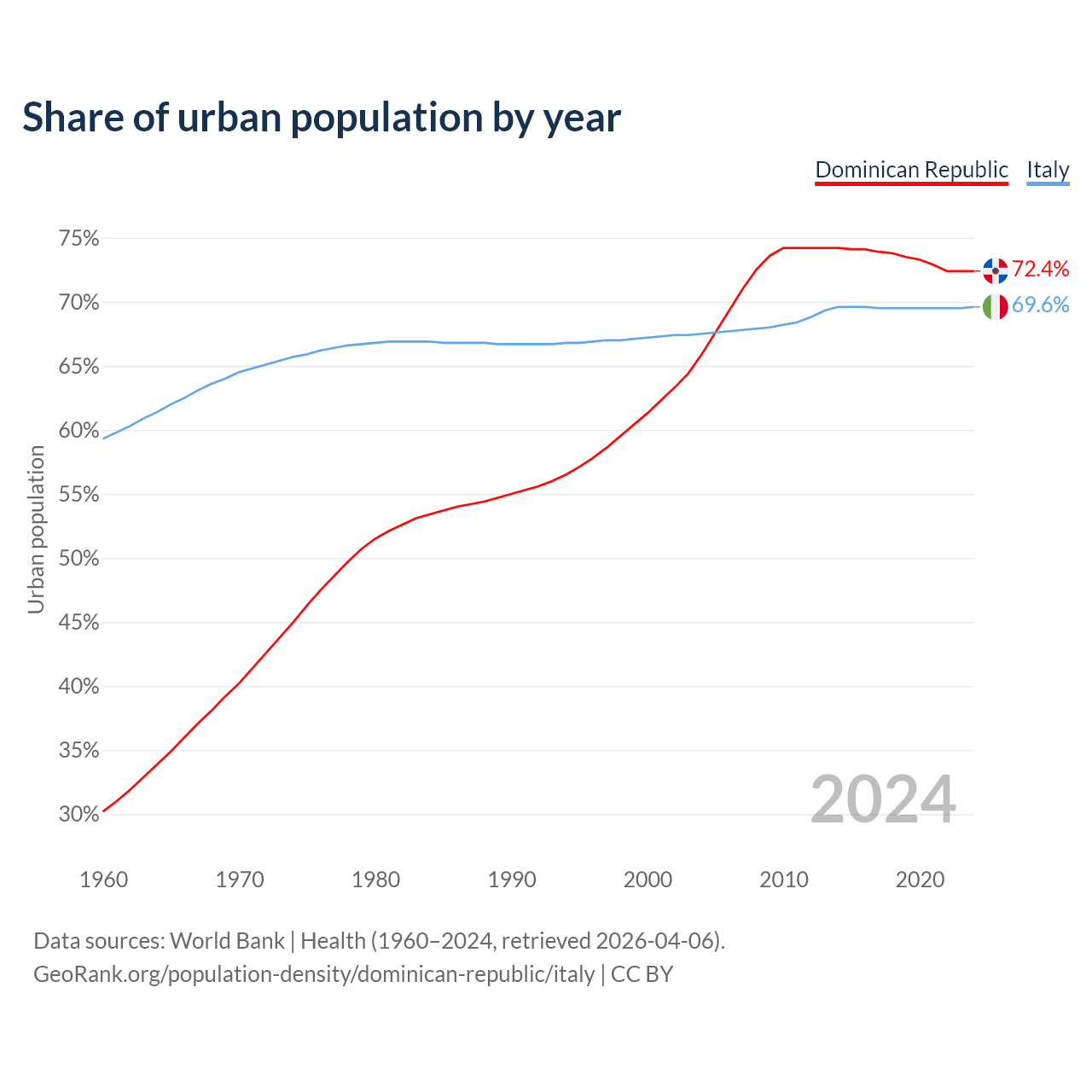 From 2004 to 2024, the share of urban population changed from 65.9% to 72.4% in the Dominican Republic and from 67.5% to 69.6% in Italy.