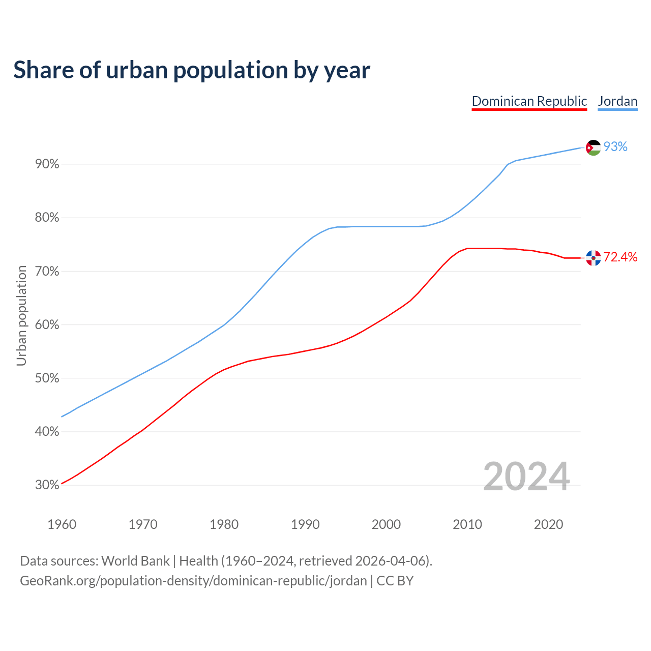 From 2004 to 2024, the share of urban population changed from 65.9% to 72.4% in the Dominican Republic and from 78.3% to 93% in Jordan.