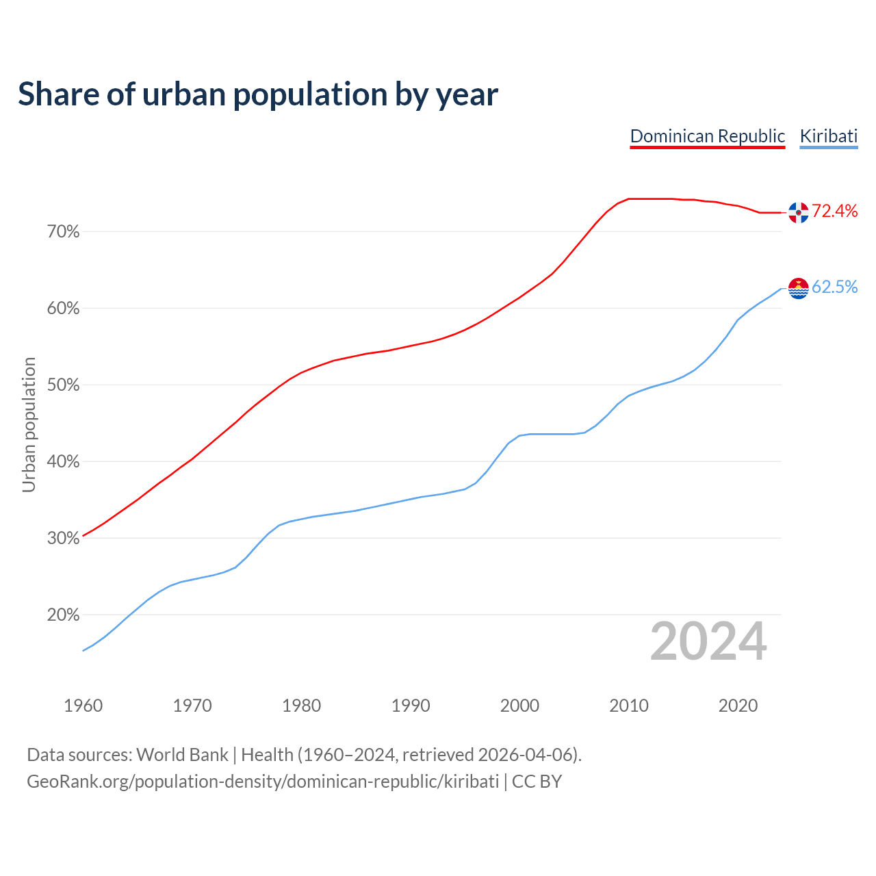 From 2004 to 2024, the share of urban population changed from 65.9% to 72.4% in the Dominican Republic and from 43.5% to 62.5% in Kiribati.