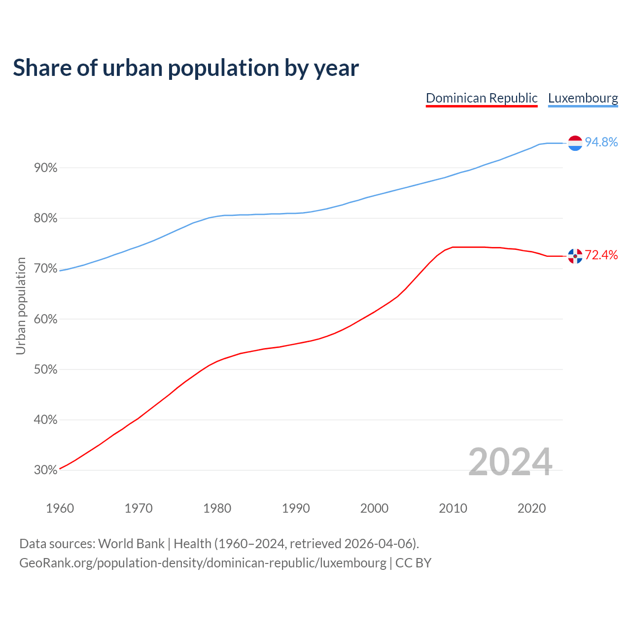 From 2004 to 2024, the share of urban population changed from 65.9% to 72.4% in the Dominican Republic and from 86% to 94.8% in Luxembourg.