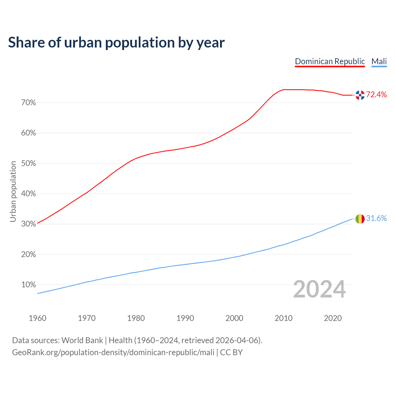 From 2004 to 2024, the share of urban population changed from 65.9% to 72.4% in the Dominican Republic and from 20.5% to 31.6% in Mali.