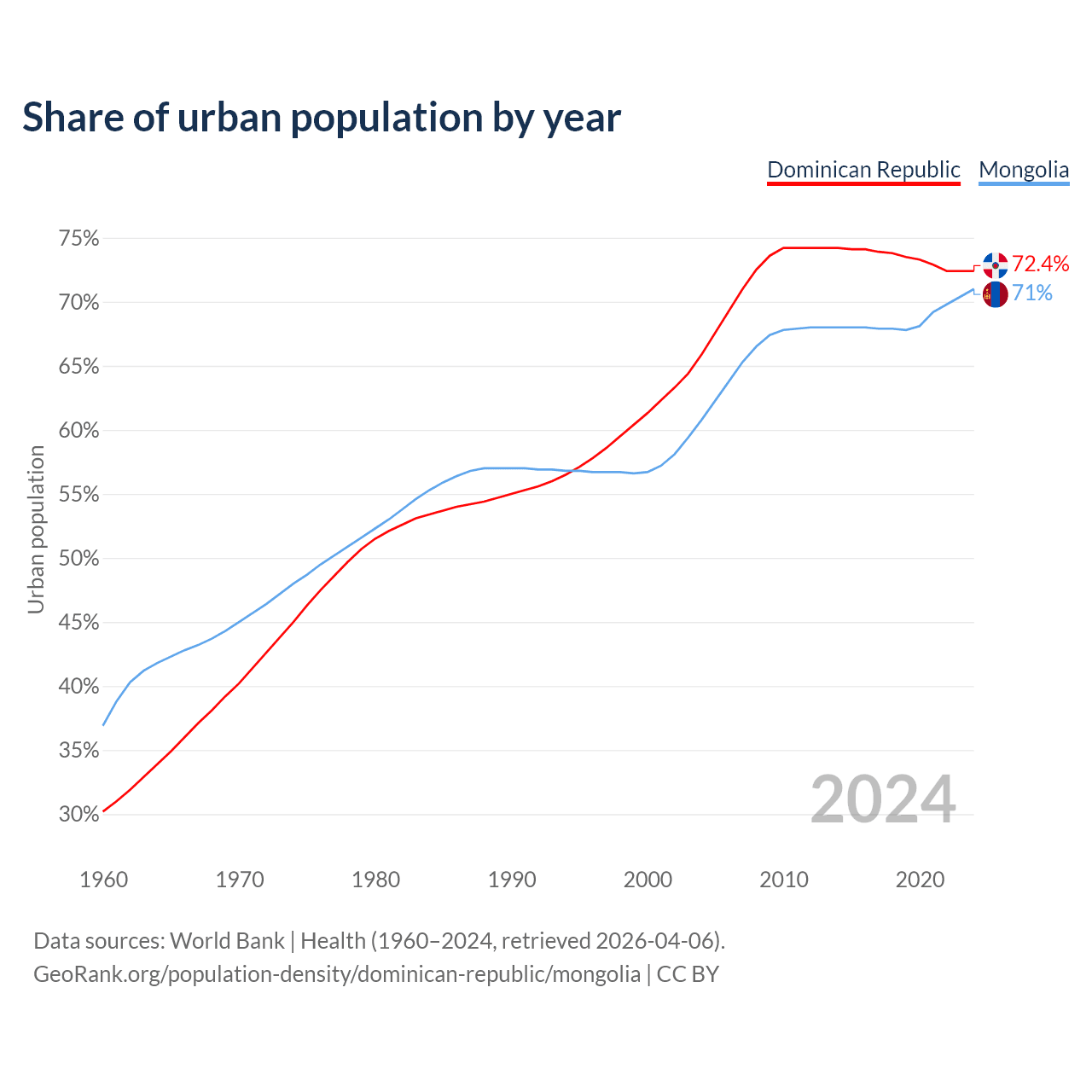 From 2004 to 2024, the share of urban population changed from 65.9% to 72.4% in the Dominican Republic and from 60.8% to 71% in Mongolia.