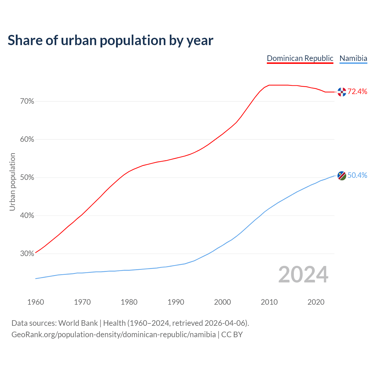 From 2004 to 2024, the share of urban population changed from 65.9% to 72.4% in the Dominican Republic and from 35.5% to 50.4% in Namibia.