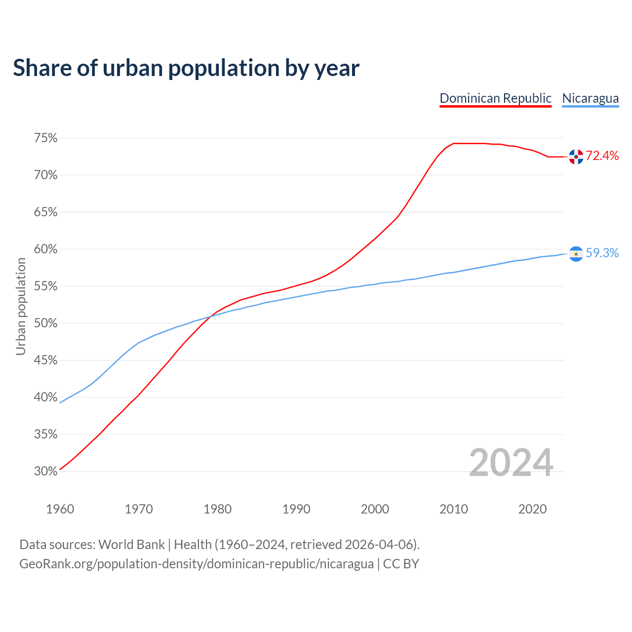 From 2004 to 2024, the share of urban population changed from 65.9% to 72.4% in the Dominican Republic and from 55.8% to 59.3% in Nicaragua.