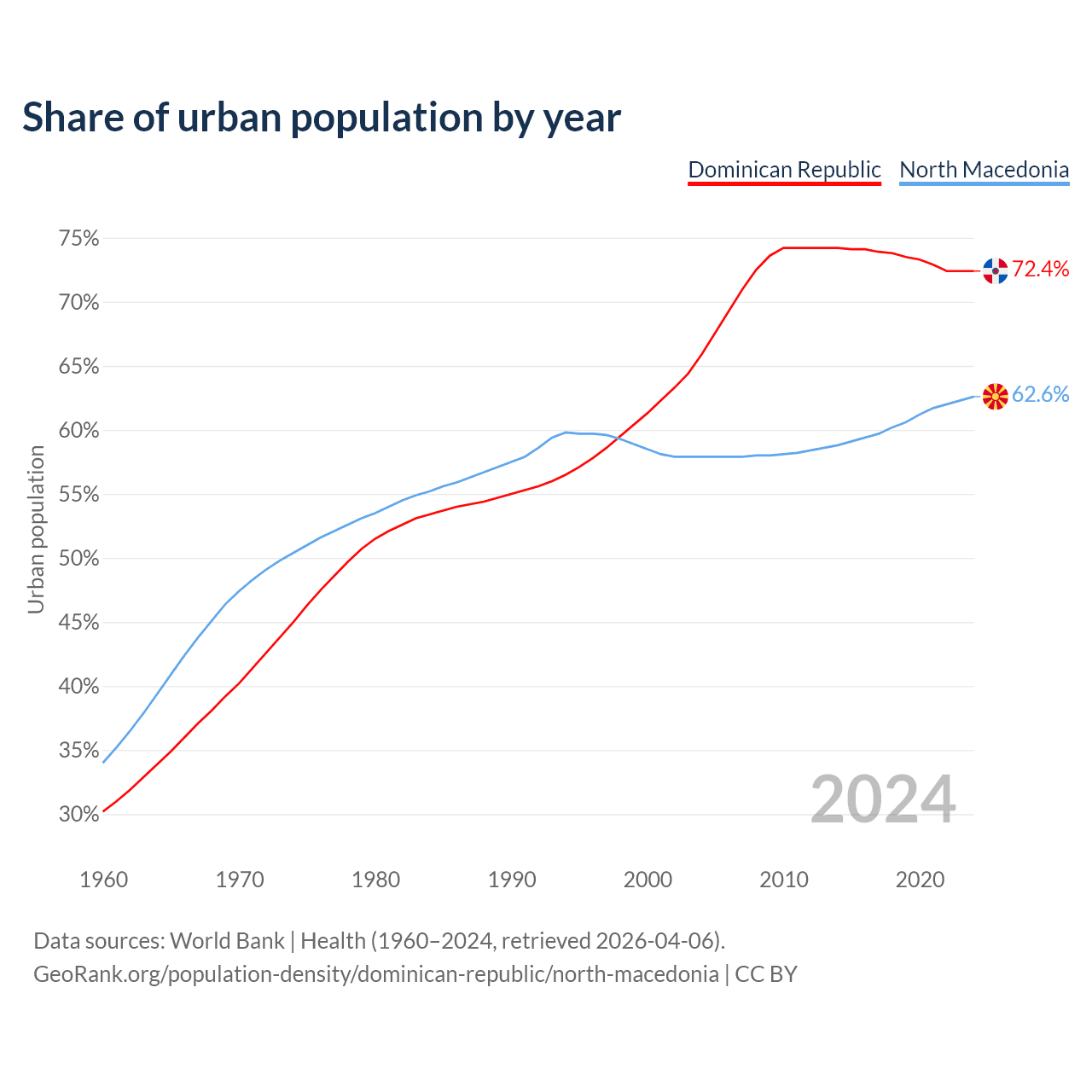 From 2004 to 2024, the share of urban population changed from 65.9% to 72.4% in the Dominican Republic and from 57.9% to 62.6% in North Macedonia.