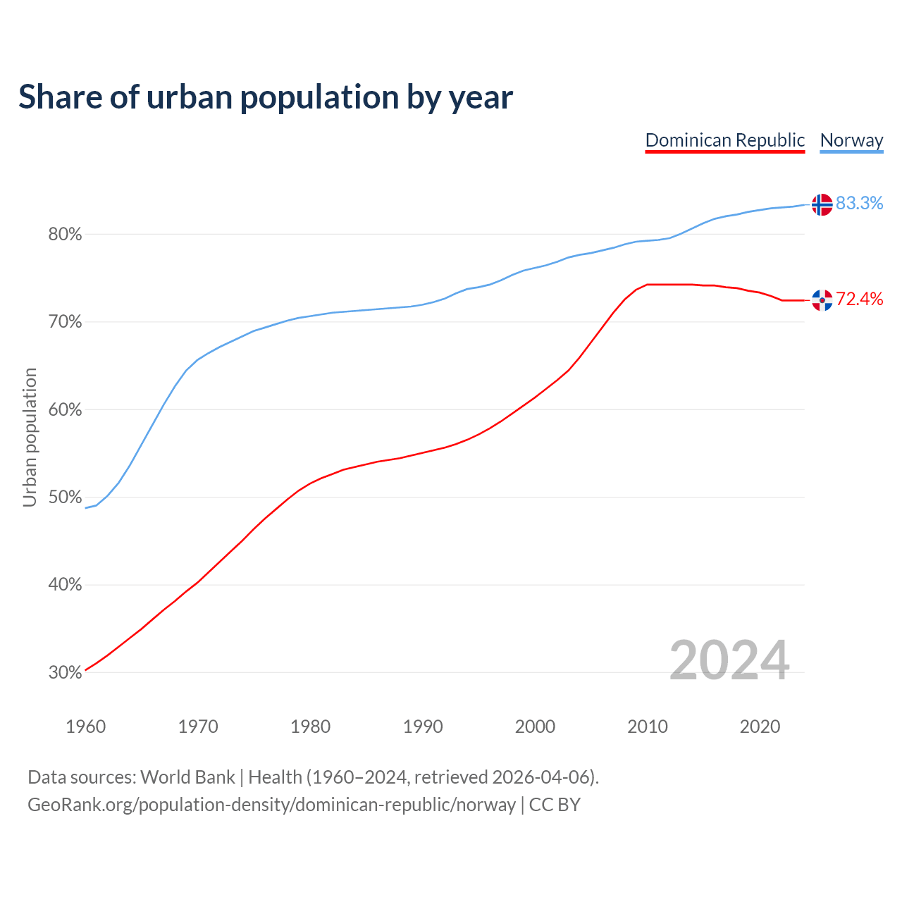 From 2004 to 2024, the share of urban population changed from 65.9% to 72.4% in the Dominican Republic and from 77.6% to 83.3% in Norway.