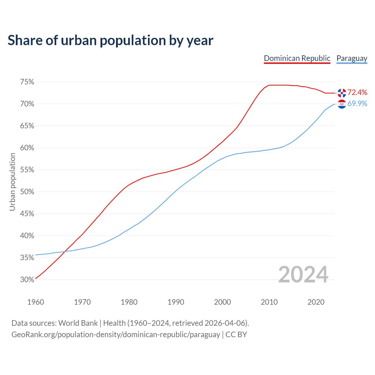 From 2004 to 2024, the share of urban population changed from 65.9% to 72.4% in the Dominican Republic and from 58.7% to 69.9% in Paraguay.