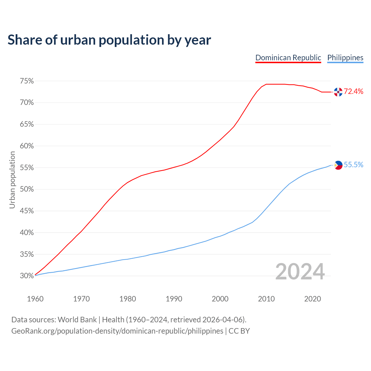 From 2004 to 2024, the share of urban population changed from 65.9% to 72.4% in the Dominican Republic and from 40.9% to 55.5% in the Philippines.