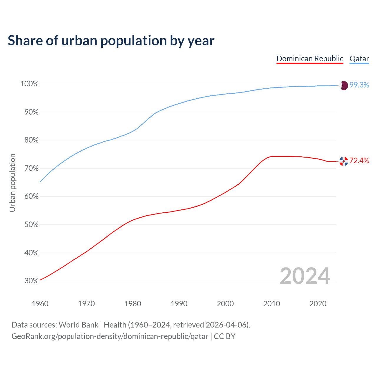 From 2004 to 2024, the share of urban population changed from 65.9% to 72.4% in the Dominican Republic and from 97% to 99.3% in Qatar.