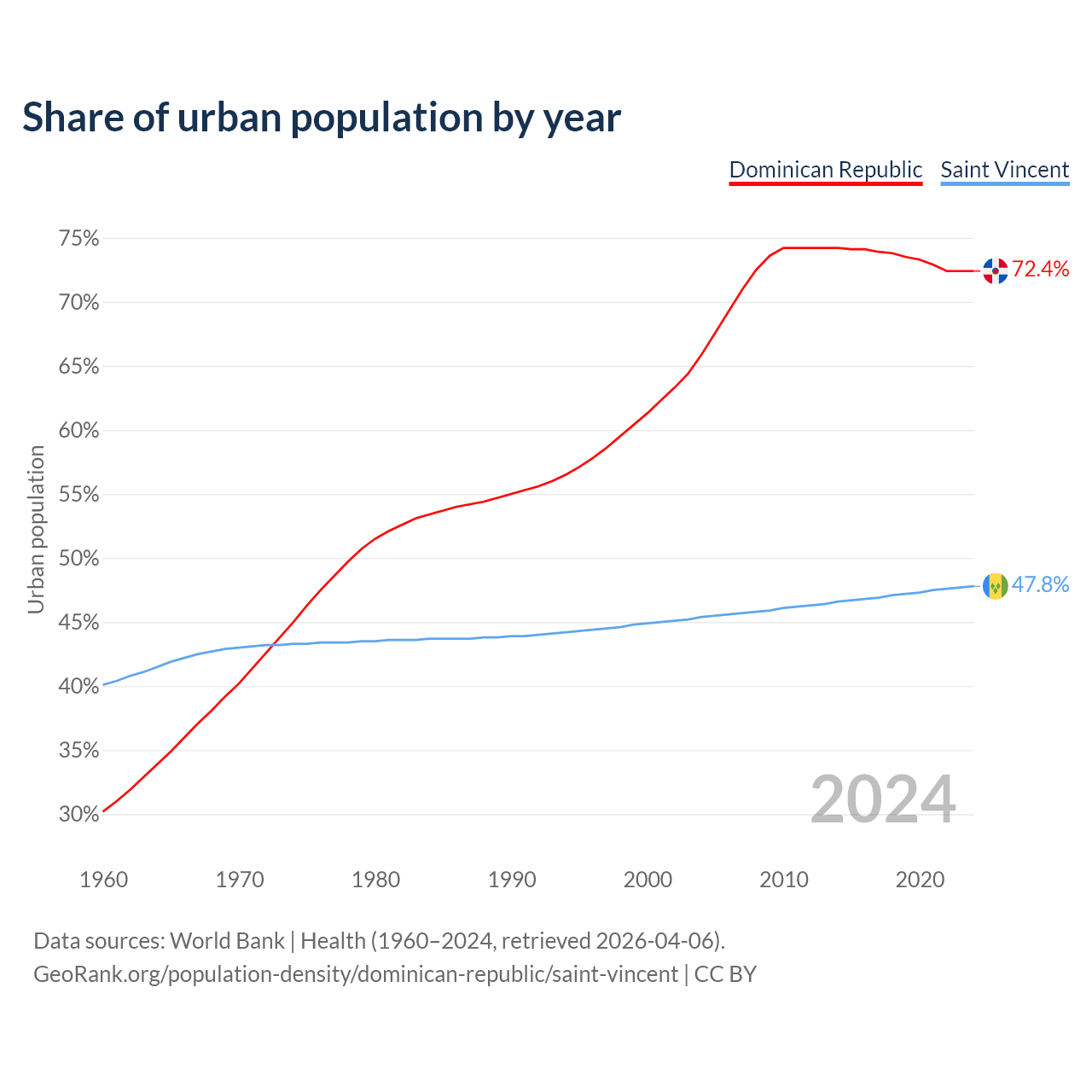 From 2004 to 2024, the share of urban population changed from 65.9% to 72.4% in the Dominican Republic and from 45.4% to 47.8% in Saint Vincent.