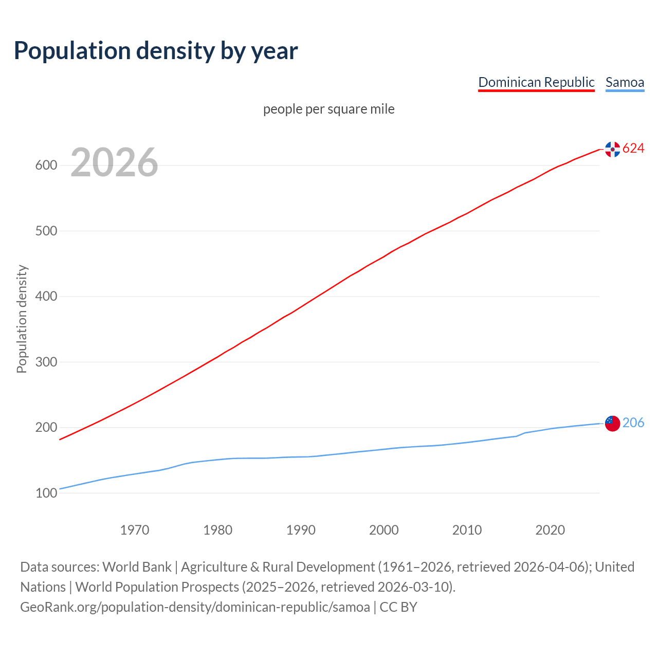 From 2006 to 2026, population density in the Dominican Republic increased by 24.6%, compared to a 19.6% growth in Samoa.