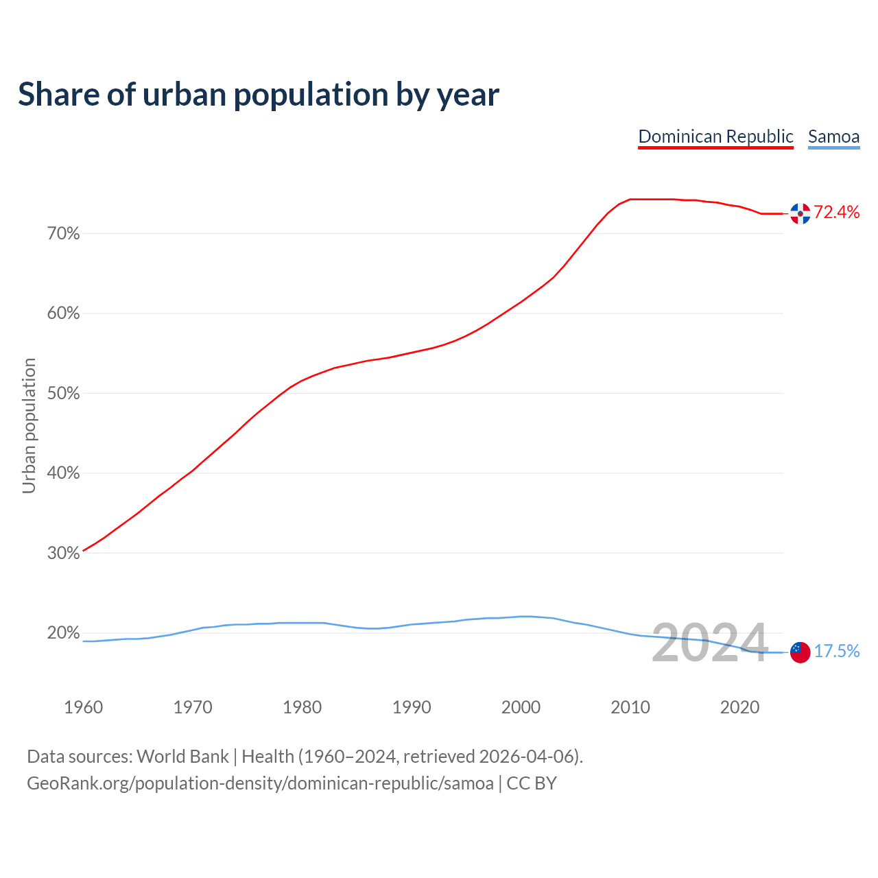 From 2004 to 2024, the share of urban population changed from 65.9% to 72.4% in the Dominican Republic and from 21.5% to 17.5% in Samoa.