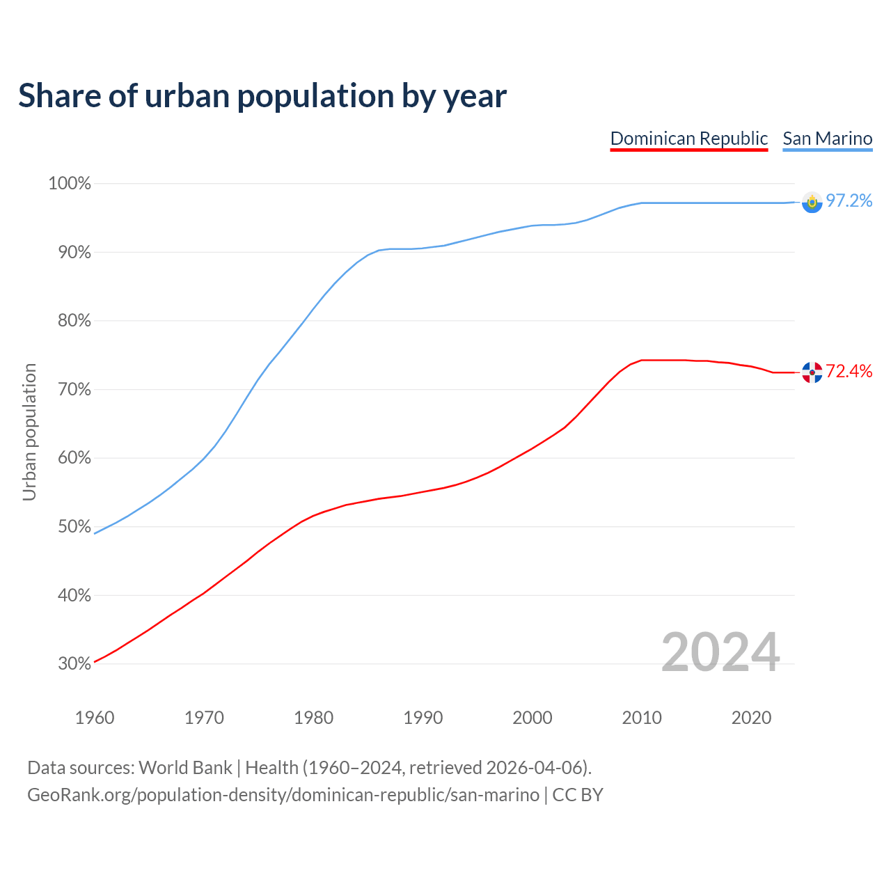 From 2004 to 2024, the share of urban population changed from 65.9% to 72.4% in the Dominican Republic and from 94.2% to 97.2% in San Marino.