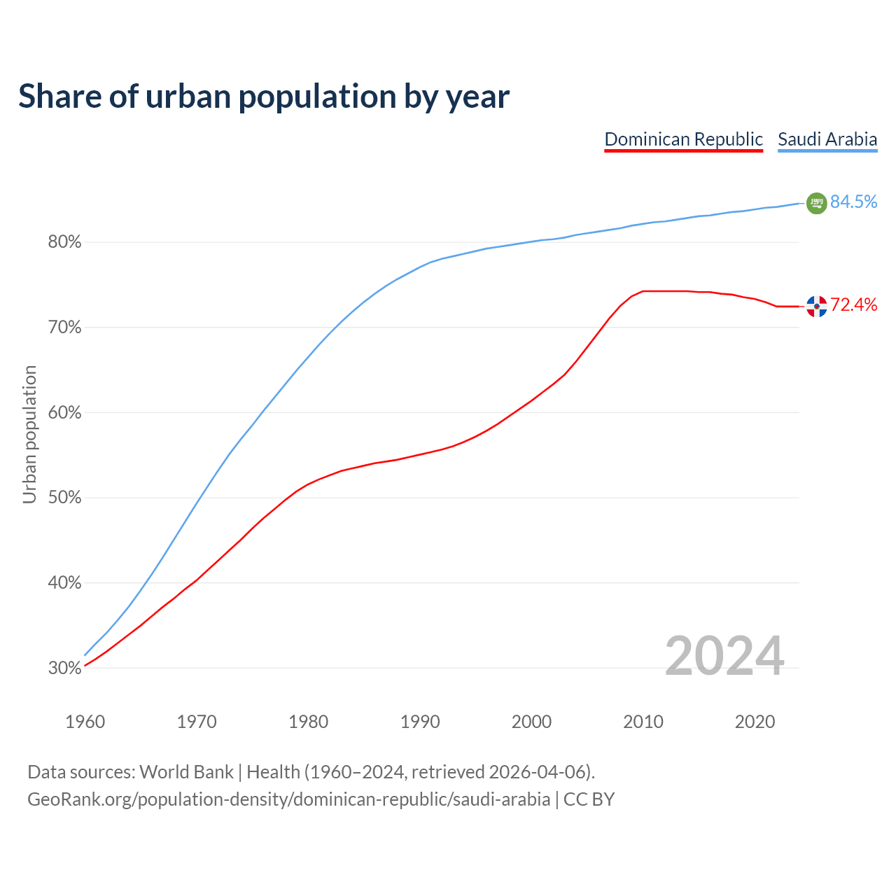 From 2004 to 2024, the share of urban population changed from 65.9% to 72.4% in the Dominican Republic and from 80.8% to 84.5% in Saudi Arabia.