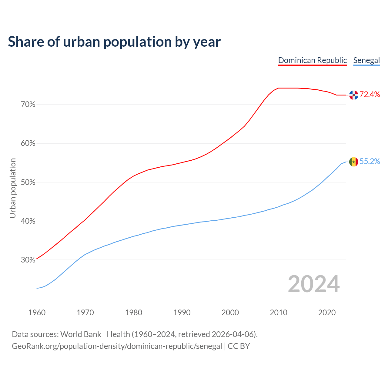 From 2004 to 2024, the share of urban population changed from 65.9% to 72.4% in the Dominican Republic and from 41.6% to 55.2% in Senegal.