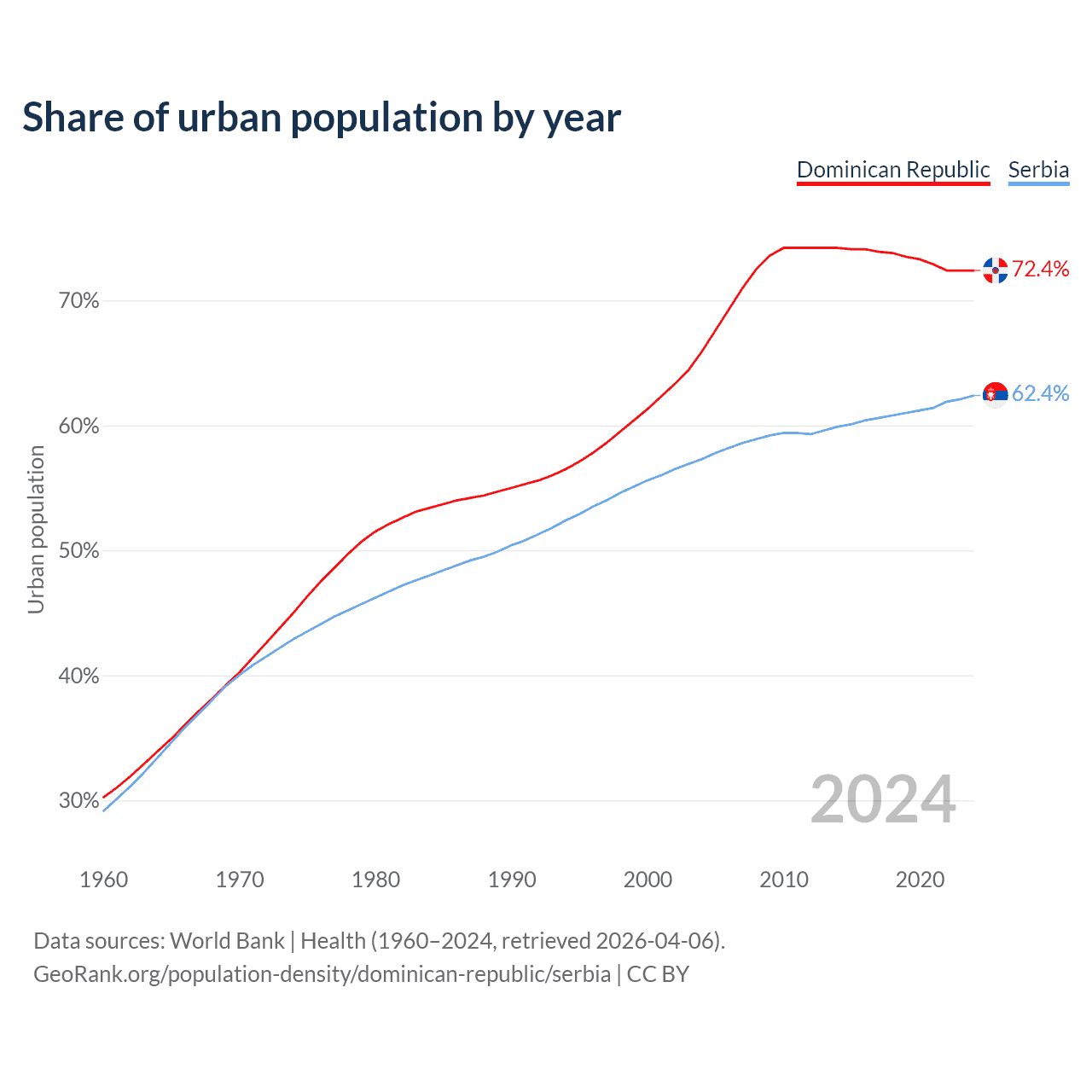 From 2004 to 2024, the share of urban population changed from 65.9% to 72.4% in the Dominican Republic and from 57.3% to 62.4% in Serbia.